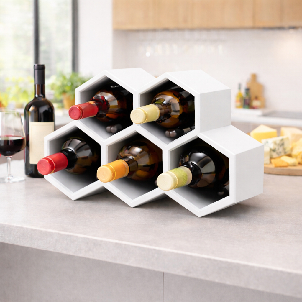 Adega Colmeia Porta Vinhos 6 Garrafas Suporte Bancada Deixe seu ambiente mais elegante e organizado com esta Adega Colmeia para 6 Garrafas de Vinho. Com design moderno em formato hexagonal, ela transforma suas garrafas em parte da decoração, trazendo um visual sofisticado para salas, cozinhas, áreas gourmet, bares ou churrasqueiras. Ideal para quem busca unir funcionalidade, organização e decoração em um único produto. PRINCIPAIS BENEFÍCIOS: Capacidade para até 6 garrafas de vinho Design moderno em formato colmeia/hexagonal Deixa o ambiente mais bonito e organizado Ideal para bancada, aparador, bar ou prateleira Estrutura resistente e visual sofisticado Produto decorativo e funcional Ótima opção para presente FICHA TÉCNICA: Produto: Adega / Porta vinhos colmeia Capacidade: 6 garrafas Cor: Preta, Branca, Bege e Cinza escuro Material: Plástico PETG Estilo: Moderno / Decorativo Uso: Bancada / mesa / aparador Conteúdo da embalagem: 1 adega colmeia para 6 garrafas INDICAÇÕES DE USO: Salas Cozinhas Áreas gourmet Churrasqueiras Bares residenciais Escritórios ou espaços decorativos Valorize seus vinhos e transforme seu ambiente com um toque moderno. Garanta já a sua adega colmeia!