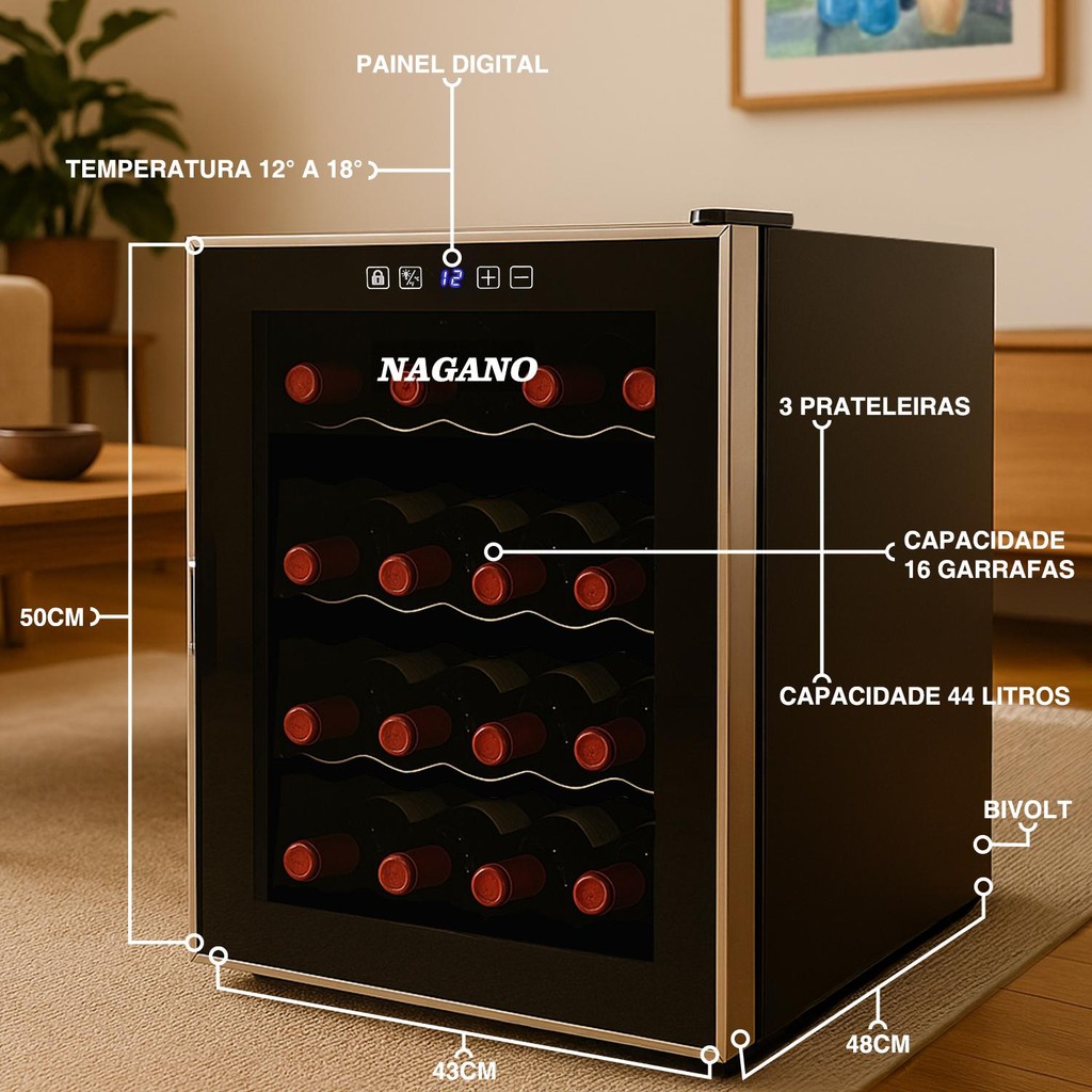 Adega de Vinhos Climatizada 16 Garrafas 44L Display Digital Bivolt – Nagano Se você valoriza a arte de degustar um bom vinho, sabe que conservar suas garrafas na temperatura correta é essencial para preservar o sabor e o aroma da bebida. A Adega de Vinhos Climatizada Nagano para 16 Garrafas é perfeita para quem quer unir sofisticação, funcionalidade e cuidado com seus rótulos favoritos. Com design moderno e compacto, ela é ideal para ambientes como cozinhas, áreas gourmet, salas de estar ou até mesmo escritórios. Seu sistema de refrigeração termoelétrico garante baixo ruído e eficiência energética, mantendo a temperatura estável entre 12°C e 18°C, ideal para a maioria dos vinhos tintos e brancos. Equipada com display digital, permite um controle prático e preciso da temperatura interna, enquanto suas 3 prateleiras internas facilitam a organização das garrafas. Além disso, com capacidade total de 44 litros, ela acomoda até 16 garrafas padrão, sendo perfeita para pequenas coleções ou para quem está começando a explorar o mundo dos vinhos. Benefícios: Armazena até 16 garrafas com eficiência e segurança. Display digital com controle de temperatura: facilidade no ajuste conforme sua preferência. Design elegante e moderno: valoriza a decoração do ambiente. Sistema de refrigeração termoel&