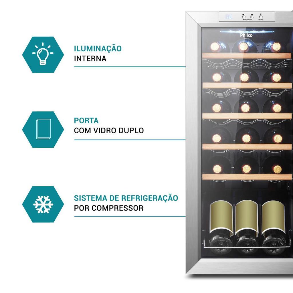 A Adega Philco 18 Garrafas 54L PAD18I é a combinação perfeita entre elegância, tecnologia e preservação do sabor. Ideal para quem aprecia bons vinhos, a Adega oferece capacidade para 18 garrafas e controle digital de temperatura, garantindo que cada rótulo seja armazenado na condição ideal. Seu painel eletrônico intuitivo e porta de vidro duplo com sistema anti-condensação asseguram praticidade e sofisticação no uso diário. Compacta e silenciosa, a Adega Philco PAD18I foi desenvolvida com sistema de refrigeração por compressor, baixo consumo de energia e gás ecológico R600a, que não agride o meio ambiente. As prateleiras deslizantes e reguláveis com detalhes em madeira facilitam o manuseio das garrafas, enquanto a iluminação interna em LED realça o visual e permite identificar facilmente os rótulos. Além de funcional, a Adega Philco conta com design moderno com porta de vidro duplo e pé frontal regulável que combina com diferentes estilos de ambiente, tornando-se uma peça de destaque na decoração. É a escolha ideal para quem busca aliar praticidade, estética e cuidado na conservação de vinhos. Com a Adega Philco 18 Garrafas 54L PAD18I, cada detalhe foi pensado para proporcionar uma experiência completa: do armazenamento à degustação. Tenha sempre seus vinhos na temperatura ideal e aprecie o verdadeiro sabor de cada momento. Capacidade para 18 garrafas (54L) Controle digital de temperatura Aparelho Compacto Prateleiras com detalhes em madeira, deslizantes e reguláveis Porta com vidro duplo e anti-condensação Luz interna (LED) Baixo nível de ruído Baixo consumo de energia Livre de CFC Sistema Refrigeração por compressor.