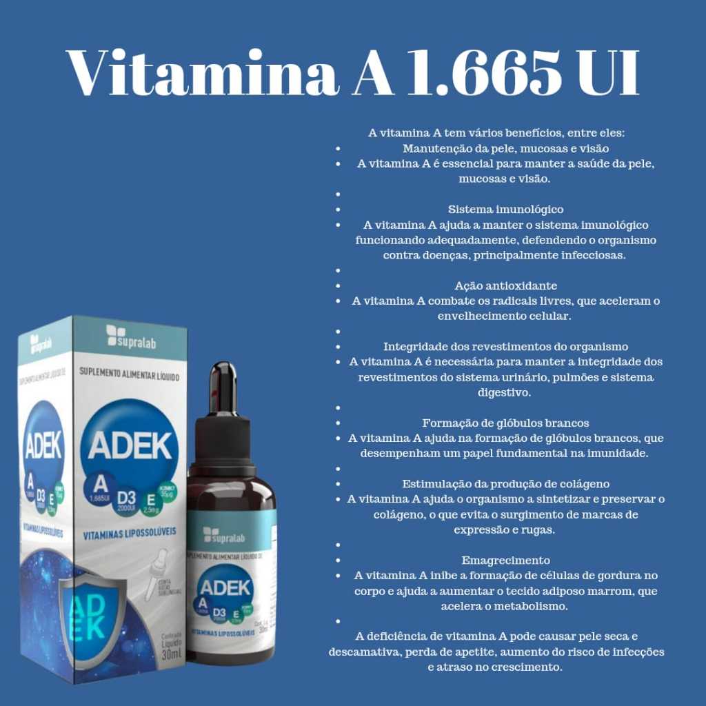 O ADEK é composto pelas vitaminas lipossolúveis A, D3, E e K2 em suas formas ativas e naturais. Juntas desempenham papéis cruciais na visão, saúde óssea, integridade da pele, função imunológica e outros processos metabólicos essenciais para o bem-estar geral e o bom funcionamento do organismo. A Vitamina A é essencial para a saúde dos olhos, pele e sistema imunológico, contribui para a visão noturna e mantém tecidos saudáveis. A Vitamina D3 é importante para a saúde óssea, facilita a absorção de cálcio e fósforo, desempenha um papel vital na função imunológica e na regulação do humor. A Vitamina E, atua como antioxidante, protegendo as células contra danos dos radicais livres, é importante para a saúde da pele e dos cabelos, além de contribuír para a saúde cardiovascular e cerebral. Não menos importante, a Vitamina K2MK7 é fundamental para a coagulação sanguínea e saúde óssea, ajuda a regular o metabolismo do cálcio no corpo, preservando a saúde dos ossos e dos vasos sanguíneos. É crucial manter um equilíbrio adequado dessas vitaminas, seja através da dieta ou de suplementação. ADEK da SupraLab é prática, saborosa e de fácil ingestão. Experimente já!