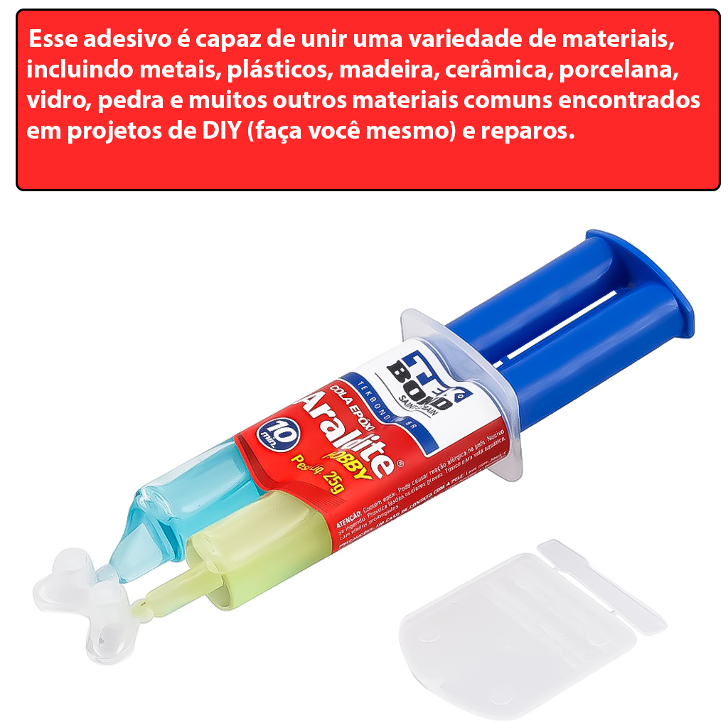 COMERCIAL VIPASA DISTRIBUIDORA Adesivo Araldite Hobby 25G Para Reparo Colagens De Pequenas Superfícies Tek Bond Tipo Seringa No uso profissional e doméstico. Araldite® Hobby é indicado para reparos e colagens de pequenas superfícies de materiais lisos, porosos ou irregulares como azulejos, madeira, vidro, concreto, fibras naturais, pedras, a maioria dos plásticos rígidos (exceto polipropileno, polietileno e Nylon®), metais e outros materiais. Resiste a temperaturas de até 70°C, secagem inicial em 10 minutos e secagem total em 8 horas. 1. Limpar as superfícies a serem coladas, deixando-as isentas de oleosidade, poeira, oxidações e restos de tintas. 2. Remova os lacres da seringa. Sem a remoção destas travas de segurança, você não conseguirá utilizar o produto. 3. Apertar a seringa até sair a quantidade desejada em uma superfície lisa (utilizar o misturador que acompanha o produto). 4. Misturar bem o conteúdo utilizando a haste até ficar homogêneo. 5. Utilizar a mistura em até 5 minutos. 6. Aplicar uma camada da mistura sobre as duas partes, pressionar e aguardar a secagem completa. 7. Fechar a seringa com a tampa, observando o encaixe. A inversão da tampa, mesmo que momentânea, pode causar a colagem da mesma na ponta da seringa. 8. Para limpar a base onde foi feita a mistura, esperar endurecer, flexionar a base e retirar a camada endurecida. O Adesivo Araldite Hobby 25g da Tek Bond é uma cola epóxi multiuso de alta performance projetada para aderir uma ampla variedade de materiais, proporcionando uma união forte e duradoura. Multiuso: O Araldite Hobby é adequado para uma variedade de aplicações, tanto em trabalhos domésticos quanto em projetos de artesanato e reparos mais específicos. Materiais Compatíveis: Esse adesivo é capaz de unir uma variedade de materiais, incluindo metais, plásticos, madeira, cerâmica, porcelana, vidro, pedra e muitos outros materiais comuns encontrados em projetos de DIY (faça você mesmo) e reparos. Forte Adesão: O Araldite Hobby oferece uma adesão extremamente forte e duradoura, proporcionando uma conexão confiável entre os materiais colados. Isso o torna adequado para aplicações que exigem alta resistência, como reparos estruturais e projetos de engenharia. Tempo de Secagem: Esse adesivo possui um tempo de secagem relativamente curto, permitindo que as peças coladas sejam manipuladas após algumas horas. No entanto, é recomendável aguardar pelo menos 24 horas para que a cola cure completamente e atinja sua resistência máxima. Fácil Aplicação: O Araldite Hobby é de fácil aplicação, podendo ser utilizado por pessoas com diferentes níveis de habilidade. Basta misturar as duas partes do adesivo (resina e endurecedor) na proporção adequada e aplicá-las uniformemente nas superfícies a serem coladas. Resistência a Temperaturas e Intempéries: Esse adesivo possui boa resistência a temperaturas extremas, umidade e intempéries, tornando-o adequado para uso em ambientes externos e em projetos que estarão sujeitos a condições adversas. Versatilidade de Uso: O Araldite Hobby é amplamente utilizado em uma variedade de projetos de DIY, como reparos em casa, montagem de móveis, criação de artesanatos, modelagem, restauração de objetos e muito mais. O Adesivo Araldite Hobby 25g da Tek Bond é uma cola epóxi multiuso de alta qualidade e performance, adequada para uma ampla variedade de materiais e aplicações em projetos de DIY, reparos domésticos e trabalhos manuais. Sua adesão forte e duradoura o torna uma escolha popular entre entusiastas do DIY e profissionais de reparos. COMERCIAL VIPASA DISTRIBUIDORA