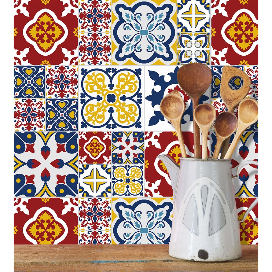 Adesivo Azulejo com detalhes em azul,vermelho, amarelo e branco