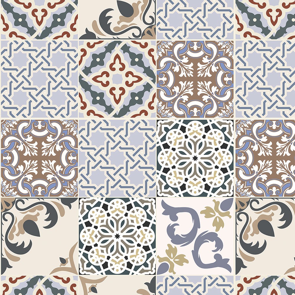 Adesivo Azulejo em tons azul, bege, marrom, cinza, e preto