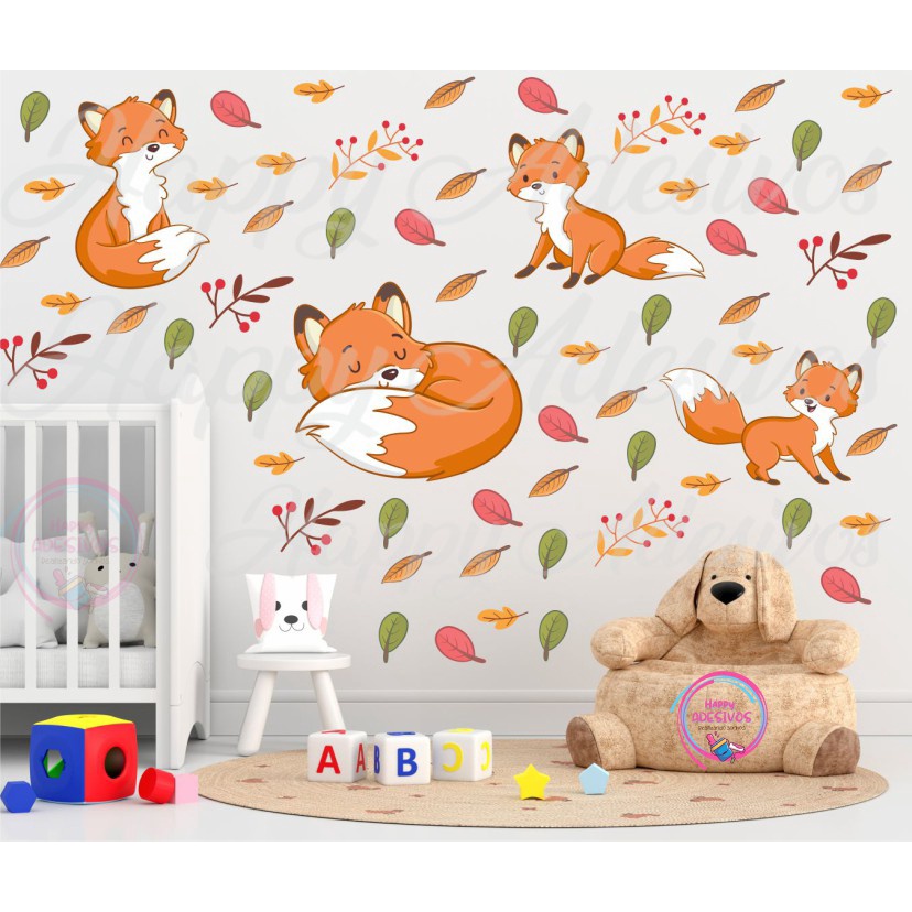 Adesivo Cartela Raposa Infantil Menina Menino Raposinha Quarto Decoração Folhas Jardim Flores