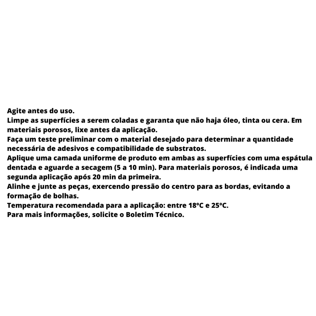 Obrigado pela preferência! Será um prazer para nós da Favita Comércio de Ferragens atendermos vocês! Somos especialistas em marketplaces, com ótima reputação em todos os que atuamos, comprovando nosso total comprometimento em atendê-los da melhor forma possível! Seguem algumas dicas sobre nossas entregas e atendimento. 1º - Nossas entregas são realizadas no mesmo dia da compra quando realizadas antes das 12hrs ou no máximo no dia seguinte, garantindo agilidade na entrega para você! 2º - Nossos estoques estão disponíveis conforme quantidades dos próprios anúncios, sendo todos os produtos A PRONTA ENTREGA! 3º - Prezamos sempre por uma ótima experiência de compra para nosso cliente, por isso, caso não esteja de acordo com o pedido realizado, temos uma equipe para pronto atendimento e resolver todas as questões da melhor maneira possível! Abaixo a descrição do produto desejado. Descrição do produto Cascola Tradicional sem Toluol é um adesivo de contato de alto desempenho, ideal para diferentes materiais e aplicações. É indicado especialmente para a colagem de laminados decorativos, pisos de borracha, couro, metais, lambris e diversos materiais sintéticos em madeiras compensadas, aglomerados, MDF, HDF, concreto, cimento, entre outros. O processo de laminação pode ser executado tanto em superfícies curvas como em planas. Pode ser utilizado em ambientes internos e externos. A aplicação com Cascola Tradicional sem Toluol é simples, proporcionando total aderência e excelente acabamento. Detalhes do produto • Possui alta força de colagem e performance • Adere em diversos materiais • Resistente à água • Não sofre inchamento, evitando possíveis desprendimentos das peças Modo de usar 1. Agite antes do uso. 2. Limpe as superfícies a serem coladas e garanta que não haja óleo, tinta ou cera. Em materiais porosos, lixe antes da aplicação. 3. Faça um teste preliminar com o material desejado para determinar a quantidade necessária de adesivos e compatibilidade de substratos. 4. Aplique uma camada uniforme de produto em ambas as superfícies com uma espátula dentada e aguarde a secagem (5 a 10 min). Para materiais porosos, é indicada uma segunda aplicação após 20 min da primeira. 5. Alinhe e junte as peças, exercendo pressão do centro para as bordas, evitando a formação de bolhas. 6. Temperatura recomendada para a aplicação: entre 18ºC e 25ºC. Aplicações Couro, Linóleo, Borracha, Folha de metal, Compensados, Fibras, MDF, Laminados decorativos (Fórmica), Concreto, Cimento, Metais e Lambris