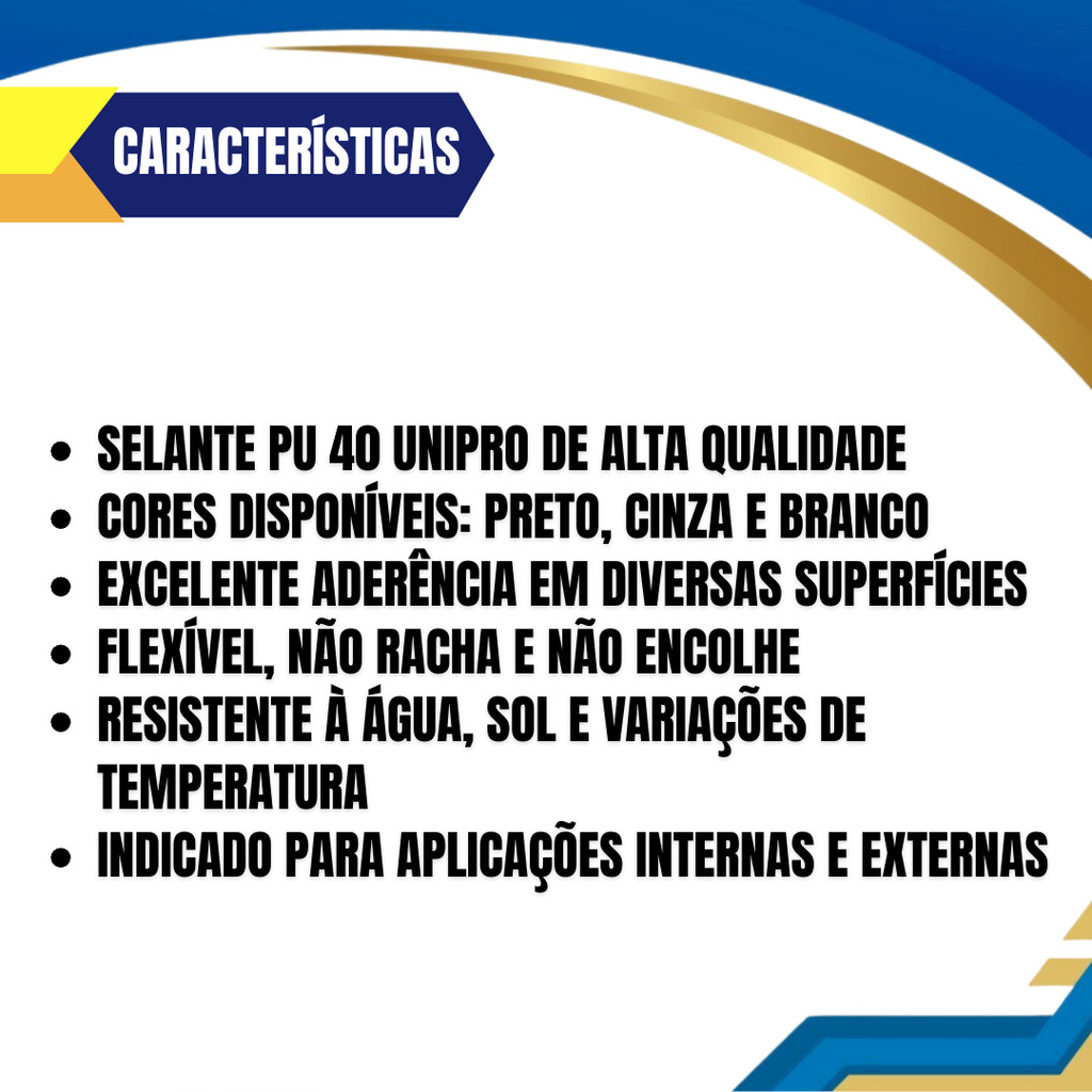 Vantagens: Dispensa o tratamento prévio com primer; Alta durabilidade; Elasticidade permanente; Aceita pintura após aplicado; Com o Cola Fixa Cuba Pu 40 Inox Mármores Granitos Vedação a aplicação é rápida e prática. Aplicações: O Cola Fixa Cuba Pu 40 Inox Mármores Granitos Vedação é indicada principalmente para colagem de vidros e espelhos em azulejos e paredes. Também indicado para vedação de madeira, móveis, juntas em automóveis, superfícies metálicas e de PVC e elementos pré-fabricados na construção civil.