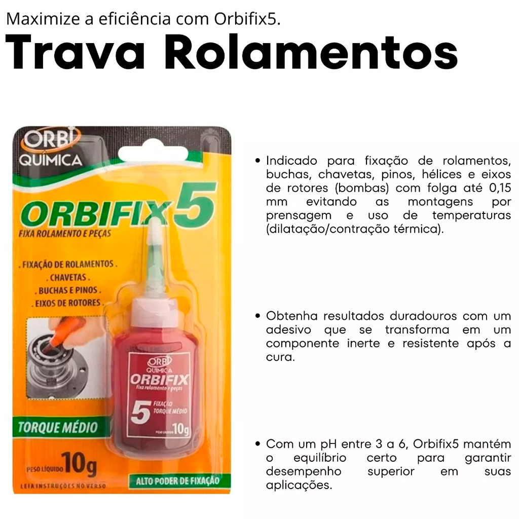 COMERCIAL VIPASA DISTRIBUIDORA. Adesivo Cola Para Rolamento Parafusos Chavetas Eixos Rotores 10g Uso Profissional - Orbifix 5 Descrição O produto FIXA ROLAMENTO ORBIFIX é um líquido mono componente, que cura entre as partes metálicas na ausência do ar, formando um componente inerte e resistente. O adesivo curado promove na montagem um contato 100% entre as partes. Indicado para fixação de rolamentos, buchas, chavetas, pinos, hélices e eixos de rotores (bombas) com folga de até 0,15mm evitando as montagens por prensagem e uso de temperaturas (dilatação/contração térmica). Modo de Usar Faça a limpeza das peças a fixar, removendo óleo, graxa e poeira. Aplicar o FIXA ROLAMENTO ORBIFIX em uma das partes e fazer a junção da outra parte, movimente as peças para que seja assegurado o preenchimento de todos os espaços em contato. Tempo total de cura 12 horas. Validade: 12 meses. Armazenagem: Armazenar em lugar fresco e seco. Mantenha na embalagem original para conservação da qualidade do produto. Manter estocado a temperatura inferior a 40°C. Não reutilizar a embalagem. Manter embalagem vedada, protegendo do contato com a umidade e oxigênio presente no ar. COMERCIAL VIPASA DISTRIBUIDORA.