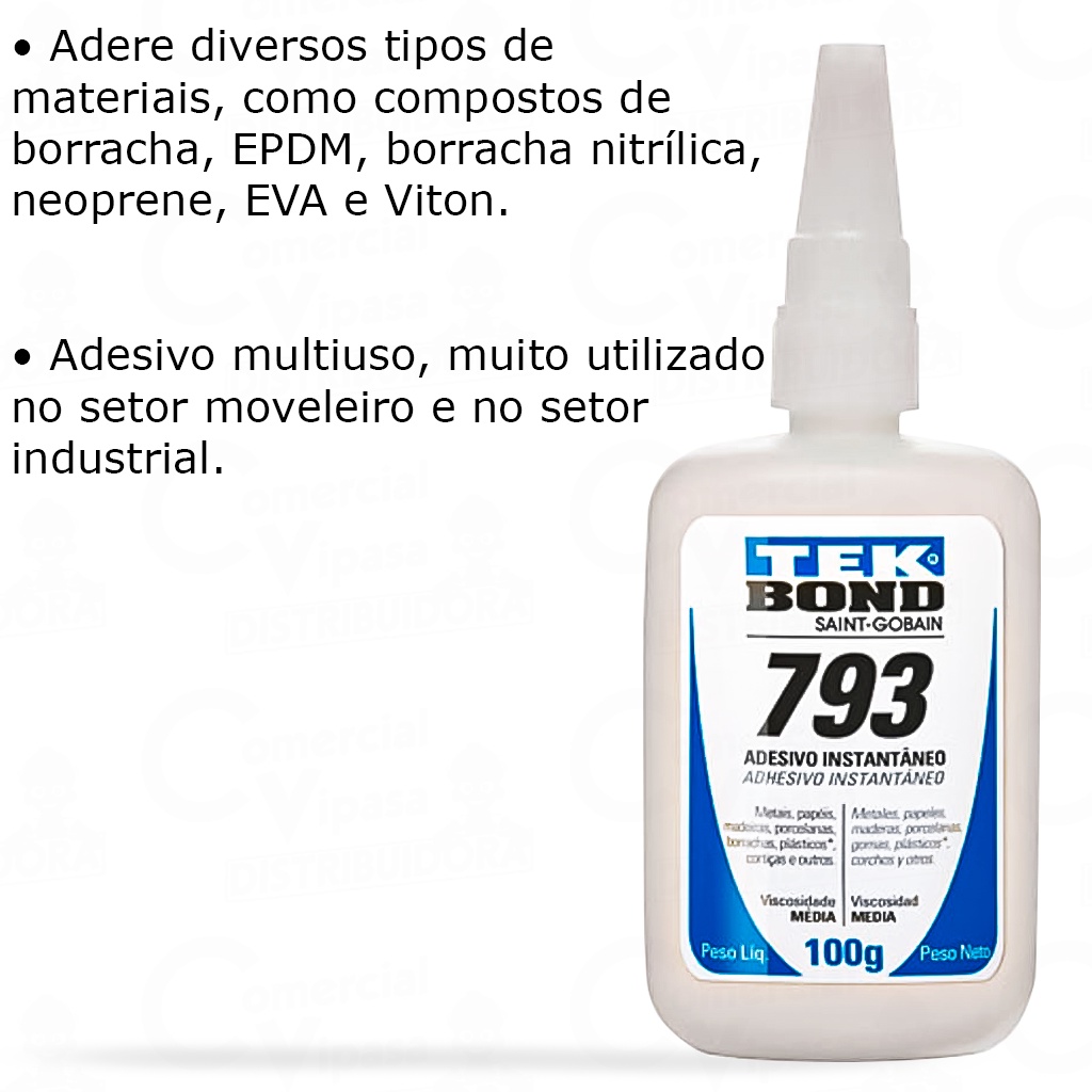 COMERCIAL VIPASA DISTRIBUIDORA. Adesivo Cola Rápido Instantâneo Multiuso Geral TekBond 793 Vários Tamanhos Cola Tudo Marcenaria Adesivo Cola Instantânea Multiuso Geral TekBond 793 / 20 - 50 - 100g Vários Tamanhos Adesivo Cola Instantânea Multiuso Geral TekBond 793 / 20 - 50 - 100g :: MARCA................................ TEK BOND :: LINHA................................ TEK BOND 793 :: FABRICANTE........................... SAINT-GOBAIN :: COR.................................. BRANCA :: PESO LÍQUIDO........................ 50g / 100g :: APLICAÇÃO............................ Metais, papéis, madeira, porcelanas, borrachas, plásticos, cortiças, etc. :: CURA TOTAL........................... 24 HORAS :: COMPOSIÇÃO........................... SOLVENTE INFORMAÇÕES ADICIONAIS: - Adere diversos tipos de materiais, como compostos de borracha, EPDM, borracha nitrílica, Neoprene, EVA e Viton. - Adesivo multiuso, muito utilizado no setor moveleiro e no setor industrial. - Produto mono componente e não requer mistura. - O processo de cura inicia-se quando uma fina camada de adesivo é aplicada entre as superfícies entrando em contato com a umidade do ar atmosférico. Tekbond 793 é ideal para colagem de metais, papéis, madeiras, porcelanas, borrachas, plásticos*, cortiças e outros. Instruções de Uso: Elimine óleo ou outras sujeiras das peças. Os adesivos colas instantâneos são conhecidos por sua capacidade de unir diversos tipos de materiais de forma rápida e eficaz. Eles são frequentemente usados em projetos de artesanato, reparos domésticos, e em muitas outras aplicações. As características específicas podem variar entre diferentes marcas e modelos, mas, em geral, eles compartilham algumas propriedades comuns: Rapidez de Ação: Os adesivos instantâneos geralmente secam em poucos minutos ou até mesmo segundos após a aplicação. Versatilidade: São projetados para colar uma variedade de materiais, incluindo plástico, metal, borracha, cerâmica e outros. Força de Ligação: Oferecem uma aderência forte e duradoura, proporcionando uma conexão robusta entre as superfícies unidas. Aplicação Fácil: Vêm muitas vezes em embalagens com bico aplicador para facilitar a aplicação precisa e controlada. Armazenamento: Devem ser armazenados em condições adequadas para preservar sua eficácia. Normalmente, isso envolve manter o recipiente bem fechado e em locais frescos. Cuidados na Utilização: É importante seguir as instruções do fabricante para garantir a aplicação correta e segura. Isso pode incluir o uso de luvas e a realização do procedimento em áreas bem ventiladas. O público-alvo do Adesivo Cola Instantânea Multiuso Geral TekBond 793 pode incluir: Artesãos Profissionais de Reparo Doméstico Indivíduos Engajados em Projetos DIY (Faça Você Mesmo) Empreendedores de Pequenos Negócios Usuários em Geral para Reparos Rápidos Adesivo Cola TekBond 793 Cola Multiuso Instantânea Cola Rápida para Artesanato Adesivo para Reparos Domésticos Cola TekBond 793 Mercado Livre Melhor Cola Multiuso Compra Adesivo TekBond Online Preço Cola Instantânea TekBond 793 Loja Online Cola Multiuso Oferta Cola Rápida Shopee Cola Multiuso de Qualidade Adesivo Rápido e Eficiente Melhor Preço Cola Instantânea TekBond Cola Resistente e Durável Compra Segura Cola Multiuso Cola Instantânea TekBond 793 Resistente Adesivo Multiuso de Alta Performance Melhor Preço Cola Rápida Online Compra Segura de Adesivo TekBond Oferta Especial Cola Multiuso Shopee Rápido Eficiente Versátil Durável Confiável Seguro Prático Inovador Econômico Profissional Benefícios do Produto: Secagem Rápida Adesão Forte Versatilidade de Uso Fácil Aplicação Resistência a Diversos Materiais Longa Durabilidade Ideal para Projetos DIY Uso Profissional e Doméstico Economiza Tempo em Reparos Múltiplas Aplicações Artigo Mercadoria Item Bem Objeto Principais Soluções do Produto: Reparos Rápidos e Eficientes Fixação Duradoura em Diversos Materiais Facilita Projetos de Artesanato e DIY COMERCIAL VIPASA DISTRIBUIDORA.