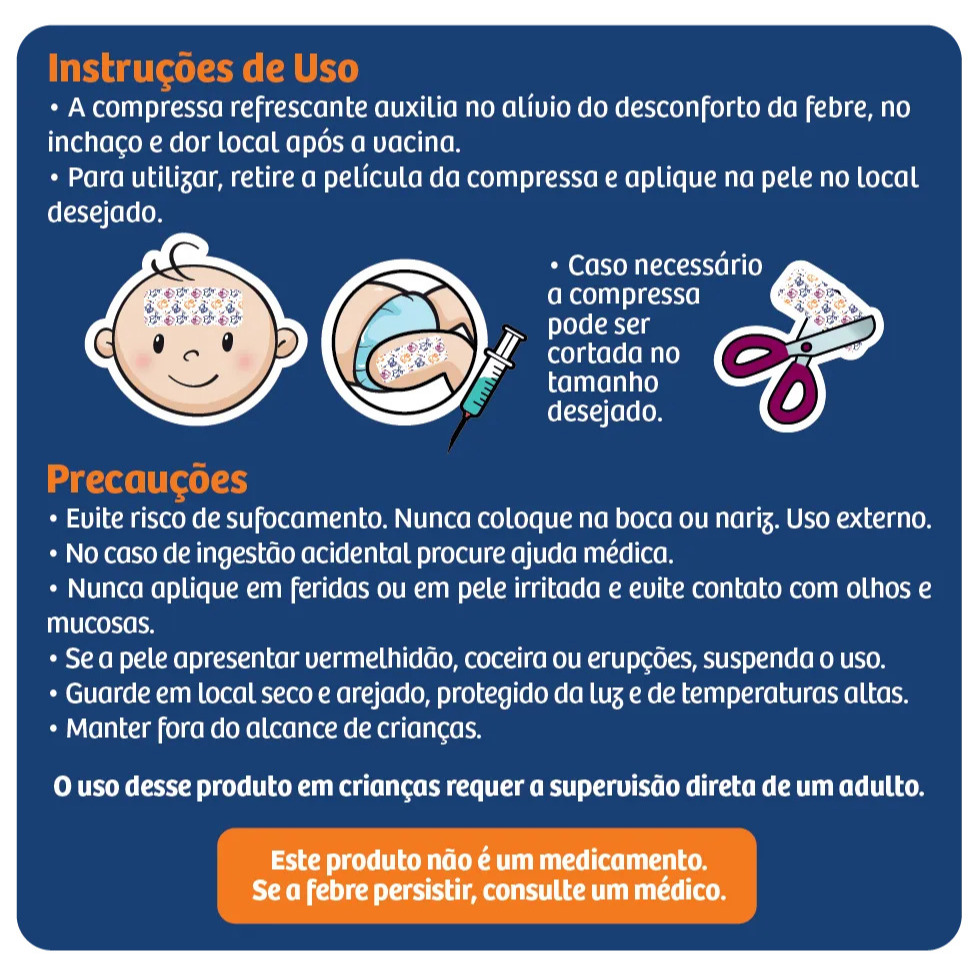As compressas refrescantes Fever Fresh são livres de substâncias tóxicas e de efeitos prejudiciais ao bebê e a criança. Fever Fresh são adesivos desenvolvidos especialmente para as crianças, com ação imediata para baixar a temperatura infantil e alívio no local das vacinas. Fever Fresh substitui as famosas compressas geladas, de forma prática e segura, pois está pronto para usar em qualquer hora ou lugar. Em casos de febre, basta colar Fever Fresh na testa da criança e nos casos de vacina, aplicar no local da injeção. Sua ação prolongada garante tranquilidade por até 8 horas. O adesivo não precisa de refrigeração para ser utilizado, pois possui um gel com efeito de resfriamento. • Características: - Pode ser usado até por bebês recém nascidos; - Alívio e frescor imediato, sem necessidade de refrigeração; - Permite que a criança / bebê durma melhor; - Dá a mamãe uma melhor noite de sono; - Higiênico; - Duração prolongada de até 8 horas de efeito; - Uso seguro, mesmo com medicação oral; - Ajustável, pois a compressa pode ser cortada em qualquer tamanho; - Não contém medicamentos; - Não contém cânfora ou parabenos; - Pronto para uso; - Embalagem abre e fecha, que conserva o produto por mais tempo; - Confeccionado em materiais atóxicos. • Modo de usar: Não é necessário refrigerar, apenas retire a película e aplique a compressa fria à pele para um alívio fresco que dura até oito horas. Após o uso, descarte. • Conteúdo da embalagem: 2 adesivos Fever Fresh. Leia e siga corretamente as instruções de uso no verso da embalagem. Imagens meramente ilustrativas. Cores podem sofrer leves alterações. A AGPMED atua há mais de 25 anos na área da saúde, 100% comprometidos em transformar momentos em experiências e é especialista no desenvolvimento e fabricação de produtos médico-hospitalares.