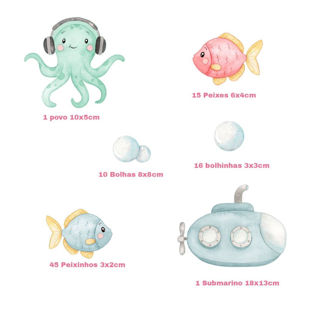 Kit 100 adesivos de parede decorativo para o quartinho da sua princesa com o tema Fundo do Mar Aquarela. 1 Sereia 15x12cm 1 Baú 12x10cm 1 povo 15x12 2 Corais 15x13cm 2 Corais 10x5cm 1 Baleia 15x12cm 1 Submarino 18x13cm 4 Peixes 10x7cm 15 Peixes 6x4cm 45 Peixinhos 3x2cm 10 Bolhas 8x8cm 16 bolhinhas 3x3cm **instalação** Fácil aplicação, é só destacar o adesivo na máscara ( parte transparente ) e aplicar onde desejar! Pode ser aplicado nas mais variadas superfícies lisas e planas: Como: Paredes, cerâmicas, metal, móveis, espelhos, vidros, eletrodomésticos, plásticos e etc. **Qualidade Garantida** Fabricado em adesivo vinil fosco, se harmoniza perfeitamente a pintura de sua parede, dando um padrão de acabamento de altíssima qualidade. O método de impressão em plotter digital usado, é uma evolução do processo convencional de fabricação, além de respeitar o meio ambiente e a sua saúde, o produto é o de mais alta qualidade. A Impressão em Plotter digital confere durabilidade e cores vivas, sem emissão de substâncias nocivas. O **VÍDEO DEMONSTRATIVO** nas fotos do anúncio verá mais detalhes sobre a impressão e qualidade do adesivo, caso não consiga ver o vídeo pelo celular, você conseguirá visualizar pelo computador. **Cuidados** Certifique-se que a superfície a ser aplicada esteja limpa e seca. Não aplique seu adesivo em locais úmidos, com imperfeições, infiltrações, rachaduras ou tinta fresca. No caso de pintura recente a parede deverá secar por 2 semanas antes da aplicação do adesivo. A limpeza deve ser realizada com uma flanela ou pano limpo e seco. Qualquer dúvida consulte o nosso time no campo de perguntas! Atenciosamente Cg Mimo Kids