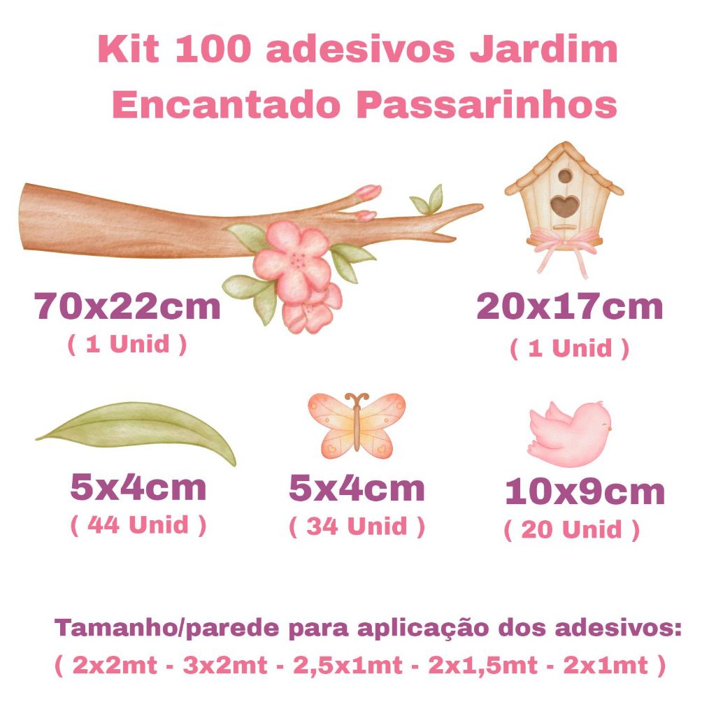 Kit 100 adesivos Jardim Encantado Passarinhos 1 Galho de árvore 70x22cm 1 Casinha 20x17cm 44 Folhas 5x4cm 34 Borboletas 5x4cm 20 Passarinhos 10x9cm Tamanho/parede para aplicação dos adesivos: ( 2x2mt - 3x2mt - 2,5x1mt - 2x1,5mt - 2x1mt ) **instalação** Fácil aplicação, é só destacar o adesivo e aplicar onde desejar! Pode ser aplicado nas mais variadas superfícies lisas e planas: Como: cerâmicas, metal, móveis, espelhos, vidros, eletrodomésticos, plásticos e etc. **Qualidade Garantida** Fabricado em adesivo vinil fosco, se harmoniza perfeitamente a pintura de sua parede, dando um padrão de acabamento de altíssima qualidade. O método de impressão em plotter digital usado, é uma evolução do processo convencional de fabricação, além de respeitar o meio ambiente e a sua saúde, o produto é o de mais alta qualidade. A Impressão em Plotter digital confere durabilidade e cores vivas, sem emissão de substâncias nocivas. **Cuidados** Certifique-se que a superfície a ser aplicada esteja limpa e seca. Não aplique seu adesivo em locais úmidos, com imperfeições, infiltrações, rachaduras ou tinta fresca. No caso de pintura recente a parede deverá secar por 2 semanas antes da aplicação do adesivo. A limpeza deve ser realizada com uma flanela ou pano limpo e seco. Qualquer dúvida consulte o nosso time no campo de mensagens! Atenciosamente Cg Mimo Kids!