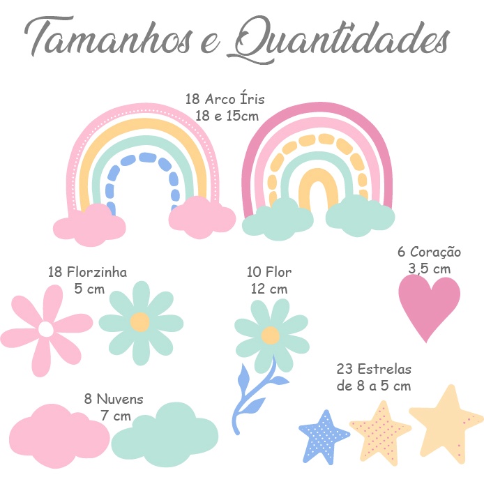 Adesivo de Parede Infantil Arco Iris Cobre 3m² Dimensões e Características *AS QUANTIDADES E TAMANHOS ESTÃO DISPONIVEIS NAS FOTOS DO ANUNCIO. Este kit contém Um Total de 83 adesivos que montados conforme a imagem, cobrem uma área de 3m². - Lavável. - Garantia de 12 meses. - Produto não tóxico. Qualidade 100% com nosso recorte inteligente os adesivos possui alta precisão e facilita a aplicação. Você mesmo pode aplicar, sem necessidade da contratação de um profissional. Onde Posso Aplicar Adesivo de Parede Superfícies e paredes lisas, com tinta acetinada, latex e acrílica, livres de poeira ou pó de gesso, móveis, espelhos, portas, box de banheiro. Não aplicar sobre tinta fresca, tinta magnética, superfícies irregulares ou texturizadas, locais com infiltrações. Qualquer duvida estamos a disposição.