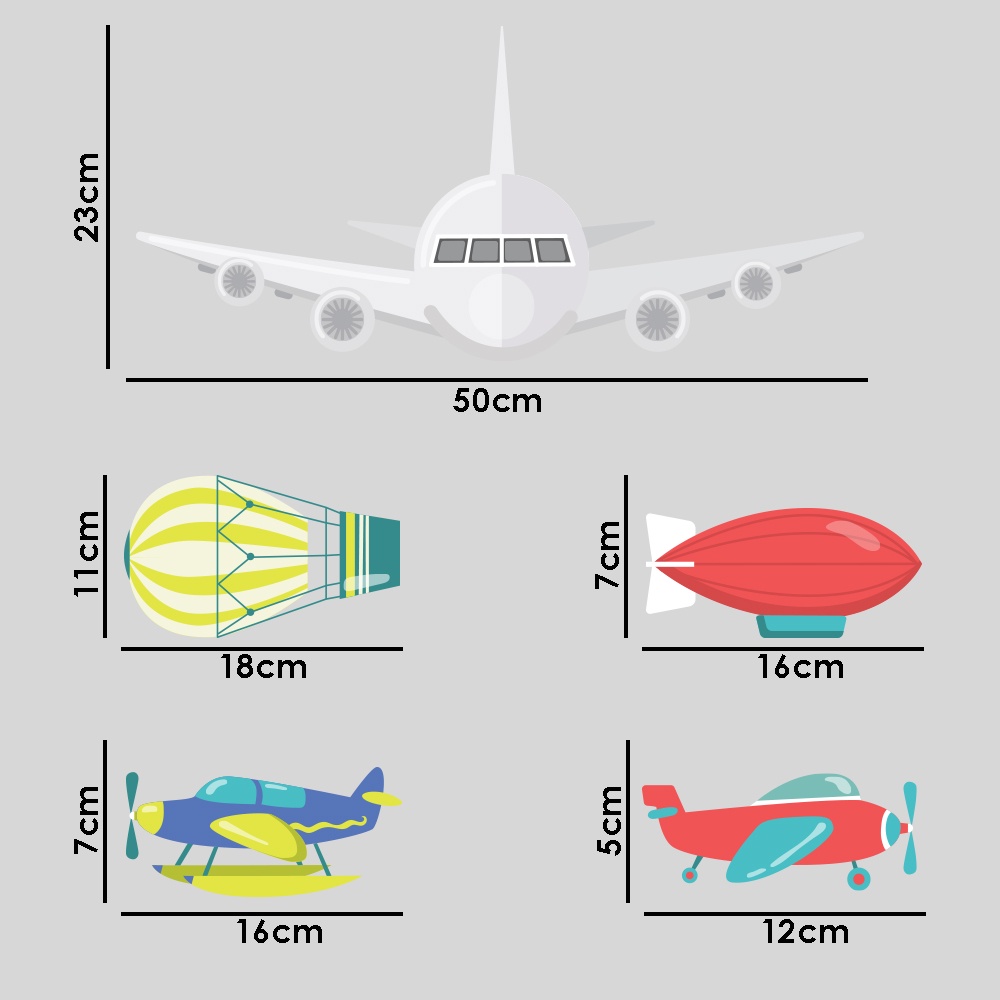 Adesivo Decorativo De Parede Infantil Avião nas Nuvens MEDIDAS: Kit 1 folha com: Folha inteira: 37cm largura X 120cm comprimento; * Avião Branco: 23cm de largura X 50cm de comprimento; * Avião Roxo: 7cm de largura X 16cm de comprimento; * Avião Vermelho: 5cm de largura X 12cm de comprimento; * Balão: 11cm de largura X 18cm de comprimento; * Dirigível: 7cm de largura X 16cm de comprimento; * Nuvem 1: 12cm de largura X 24cm de comprimento; * Nuvem 2: 8cm de largura X 25cm de comprimento; * Nuvem 3: 7,5cm de largura X 23cm de comprimento; * Nuvem 4: 4,5cm de largura X 13cm de comprimento; * Nuvem 5: 3,8cm de largura X 8cm de comprimento; * Nuvem 6: 4,5cm de largura X 13cm de comprimento; * Nuvem 7: 7,5cm de largura X 16cm de comprimento; * Nuvem 8: 6cm de largura X 13cm de comprimento; MATERIAL: -adesivo vinílico fosco não tóxico TIPO DE IMPRESSÃO: - Impressão em alta resolução livre de imperfeições. OBSERVAÇÕES: - Podem ser colocados no quarto das crianças, na sala de estudos, no escritório, na geladeira, na sala de brinquedos, no box do banheiro ou em muitos outros lugares. - A aplicação é muito simples, é só tirar o adesivo e colar como quiser. - Os Adesivos já seguem com os recortes para agilizar e facilitar sua instalação, cortes feitos com alta precisão no momento da impressão para garantir a melhor qualidade. - Podem ser aplicados em paredes lisas, com tinta acetinada, latex e acrílica, móveis, espelhos, portas, box de banheiro, livres de poeira ou pó de gesso. Não aplicar sobre tinta fresca, tinta magnética, superfícies irregulares ou texturizadas, locais com infiltrações. * Imagem ambiente ilustrativa PRODUTO NÃO TOXICO