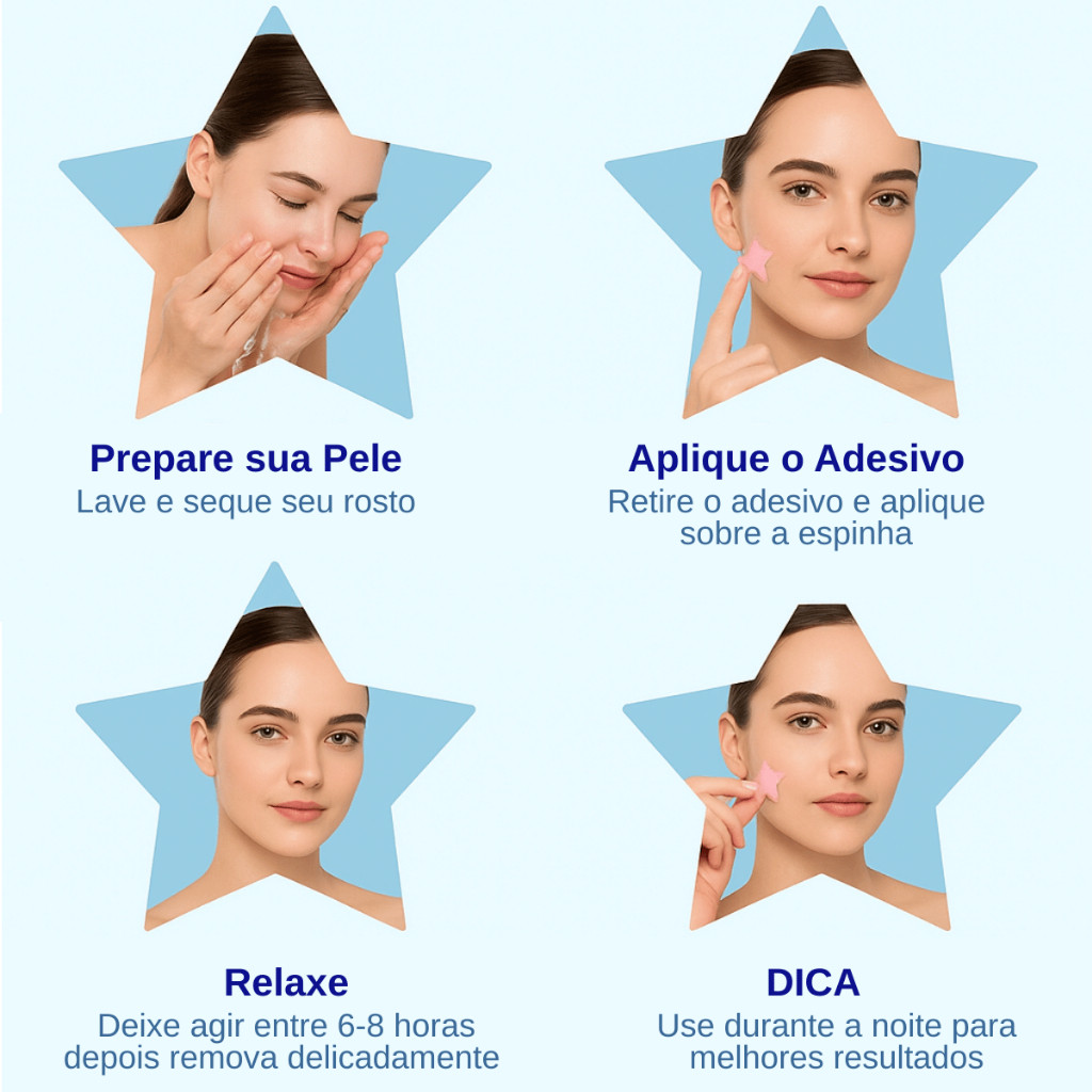 Opções de Compra: 1 cartela com 40 adesivos, 2 cartelas com 40 adesivos cada (80) ou 6 cartelas com 40 adesivos cada (240) e cores aleatórias de acordo com a disponibilidade. Alto Custo-Benefício Compre em Kits e economize ainda mais! Benefícios incríveis: ⭐ Função poderosa: encolhe e elimina a acne mais rápido. ⭐ Design estiloso: parece acessório de moda (estrelas coloridas ). ⭐ Amigo da pele: hidrocolóide + óleo de melaleuca + calêndula. ⭐ Prático: fácil de aplicar, pode usar em qualquer lugar. ⭐ Econômico: muita quantidade por um preço acessível. Especificações: Material: Hidrocoloide + Óleo de Árvore do Chá + Óleo de Calêndula Tamanhos: 8mm / 10mm / 12mm Pacote: Saquinhos Transparentes com seus adesivos dentro Validade: 3 anos Função: seca espinha, reduz inflamação, evita cicatriz e manchas Como usar: 1️⃣ Limpe e seque bem a pele 2️⃣ Escolha o tamanho ideal do adesivo 3️⃣ Aplique diretamente na espinha 4️⃣ Deixe agir por algumas horas ou durante a noite 5️⃣ Troque quando necessário