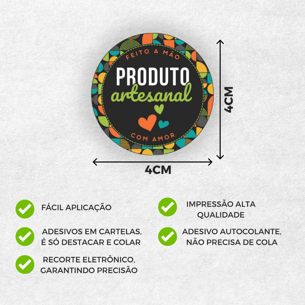 INFORMAÇÕES DO PRODUTO: - Adesivo Produto Artesanal Feito a mão com Amor - Tamanho: 4x4cm - Material: Adesivo Couche - Recorte: Eletrônico com acabamento preciso _____________________________________________________ OBSERVAÇÃO: • Não é possível adicionar ou alterar a arte! • Não garantimos a fidelidade de cores sobre as impressões, podendo apresentar variação de intensidade e tonalidade das cores em relação ao que é visualizado no monitor. _____________________________________________________ A Sou Papers agradece por sua escolha! É um prazer fazer parte das suas conquistas, proporcionando produtos de qualidade e personalizados com carinho. Conte sempre com a gente!