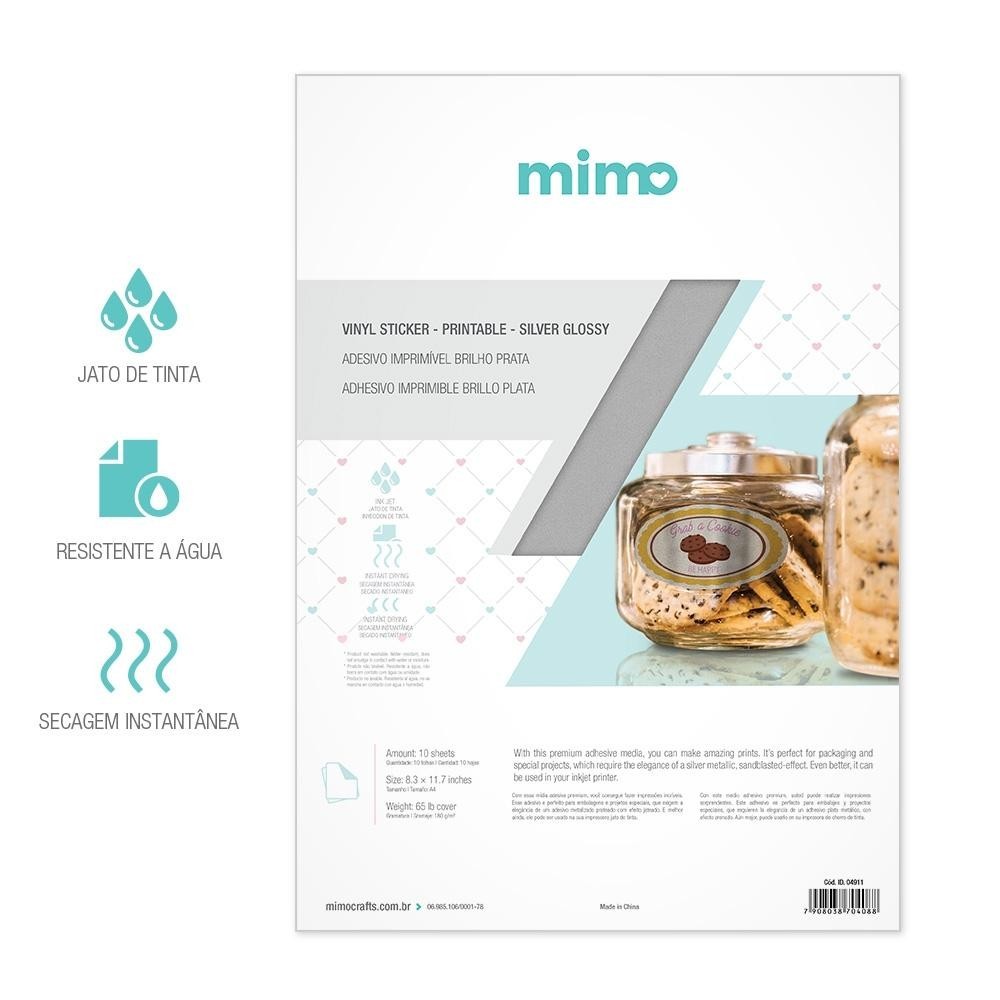Adesivo Imprimível Brilho Prata - Mimo O Adesivo Imprimível Brilho Prata - Mimo - A4 - 180g - 10 Fls é um material adesivo de fabricação Premium que te permite fazer adesivos personalizados com muita sofisticação. Ele possui superfície brilhante na cor prata. A embalagem do Adesivo Imprimível Mimo vem com 10 folhas no tamanho A4 e gramatura de 180 g/m². Esse Adesivo Imprimível tem superfície tratada para impressão a jato de tinta com secagem instantânea, o que garante qualidade muito superior nas impressões feitas nele. Além disso, ele é resistente à água, ou seja, está tudo a salvo se respingar gotinhas de água em seus projetos personalizados com esse adesivo Mimo. Mas, não para por aí, pois o Adesivo Imprimível Brilho Prata Mimo também garante cortes precisos nas plotters de corte de todas as marcas do mercado craft. Ou seja, ele é perfeito para fazer print and cut nas principais máquinas de cortar papéis. Perfeito para Fazer Adesivos Personalizados O Adesivo Imprimível Brilho Prata - Mimo é perfeito para personalizar embalagens e projetos especiais, que exigem a elegância de um adesivo brilhante prata. Ele é ideal para personalizar projetos de scrapfesta, scrapbook, papercraft low poly, encadernação, convites, home decor, cartões de visitas, papelaria empresarial, tags e muito mais! Informações Técnicas: Produto: Adesivo Imprimível Brilho Prata - Mimo - A4 - 180g - 10 Fls Qualidade: Premium Quantidade: 10 Fls Tamanho: A4 Gramatura: 180 g/m² Cor: Prata Acabamento: Brilhante Resistência: Á água Impressão Compatível: Jato de Tinta Secagem da Impressão: Instantânea Material Predominante: Papel e similares Marca: Mimo Crafts Código de Fábrica (SKU): 04911