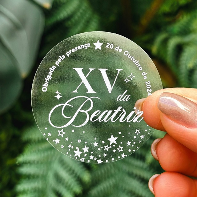 Lembre-se de selecionar a quantidade nas variações do anúncio! Excelente opção de etiqueta adesiva para aniversário de 15 anos! - Tamanho: 5x5cm (redondo) - BOPP transparente - Impressão Branca (consulte outras cores) Após a compra, entre em contato conosco via chat para envio da arte ou para o envio das iniciais, da data e dos nomes desejados :) Prazo para Produção: 3 dias úteis Atenção: Caso o cliente não envie a arte (ou envie as iniciais) até o prazo máximo para postagem, será enviado adesivos prontos de mimos e embalagens. #### IMPORTANTE ##### - RESISTENTE À ÁGUA 💧 - RESISTENTE AO FRIO E AO CALOR 🥶 🥵