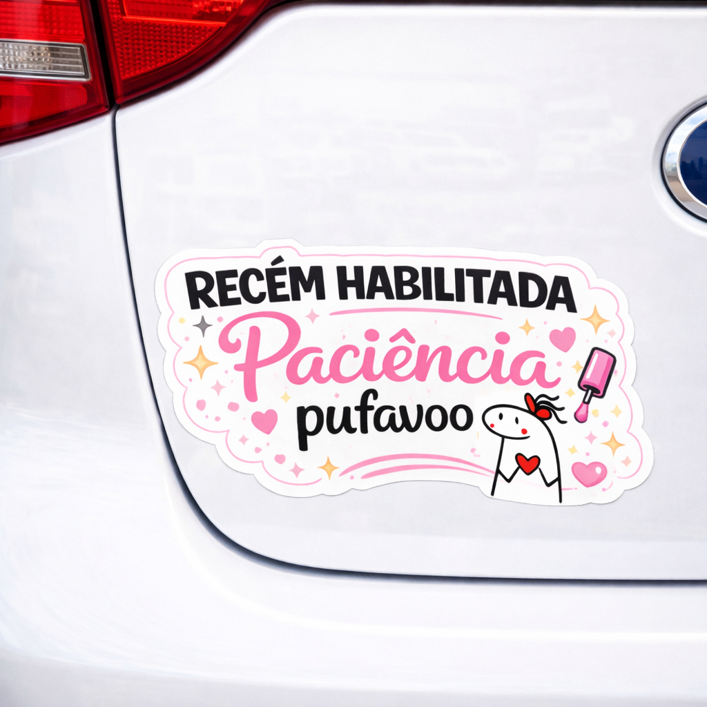 ✨ Adesivo Automotivo – Recém Habilitada ✨ Deixe seu carro ainda mais fofo e divertido com este adesivo exclusivo para motoristas recém-habilitadas! 💖 Com design delicado em tons de rosa, ilustrações encantadoras e frase bem-humorada, ele transmite leveza e personalidade no trânsito. 📐 Medidas: ✔ 20 cm (largura) x 10 cm (altura) 🧵 Características: ✔ Impressão em alta qualidade HP Latex com durabilidade garantida ✔ Cores vivas e duráveis ✔ Recorte personalizado ✔ Fácil aplicação ✔ Ideal para tampa traseira, vidro ou lataria 🚗 Indicação: Perfeito para quem está começando a dirigir e quer se destacar com estilo, bom humor e charme. 🎁 Ótima opção para presentear recém-habilitadas!