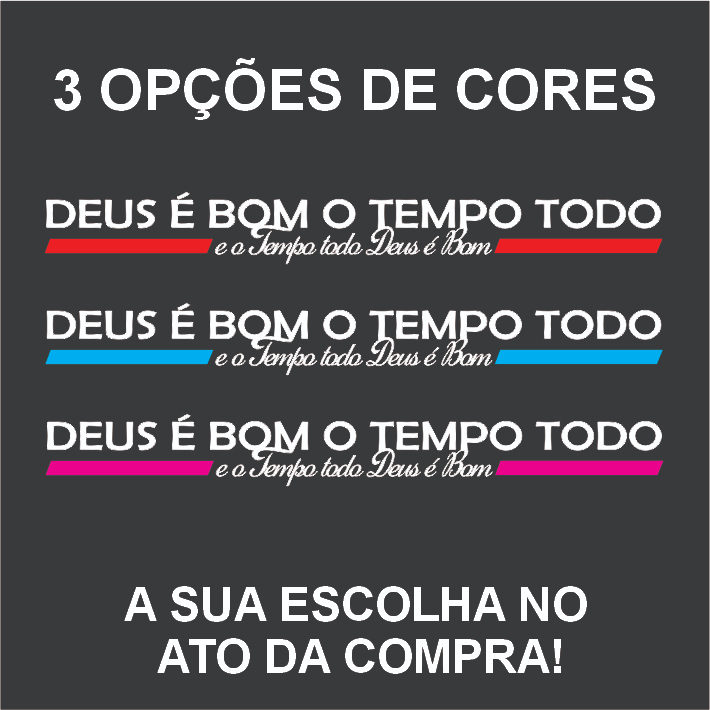 Adesivo Parabrisa Carro Deus é Bom o Tempo Todo | Adesivo Religioso Automotivo | Sticker Gospel para Vidro Traseiro Transforme seu carro com o adesivo parabrisa “Deus é bom o tempo todo”, ideal para quem busca um adesivo religioso para carro, adesivo gospel automotivo ou frase cristã para vidro traseiro com alta qualidade e impacto visual. Este adesivo para parabrisa traseiro é produzido em material resistente, com excelente durabilidade e fácil aplicação. Perfeito para motoristas que desejam expressar sua fé com um adesivo cristão para carro, elegante e visível. ⭐ Benefícios e Diferenciais Alta durabilidade: resistente ao sol, chuva e lavagens Fácil aplicação: adesivo automotivo prático, sem bolhas Recorte profissional: acabamento limpo para vidro traseiro Design moderno: destaque com frase “Deus é bom o tempo todo” Versátil: ideal como adesivo gospel carro ou adesivo religioso automotivo 🚗 Aplicações e Usos Perfeito para: Parabrisa traseiro de carros Vidro de automóveis, SUVs e hatch Personalização automotiva religiosa Quem busca adesivo frase cristã carro, adesivo evangélico automotivo ou sticker gospel vidro carro Destaque sua fé no dia a dia com um adesivo para carro Deus é bom o tempo todo, uma escolha ideal para quem procura adesivo religioso para parabrisa, adesivo cristão automotivo e personalização de carro gospel. Garanta já seu adesivo automotivo religioso e leve uma mensagem positiva por onde passar