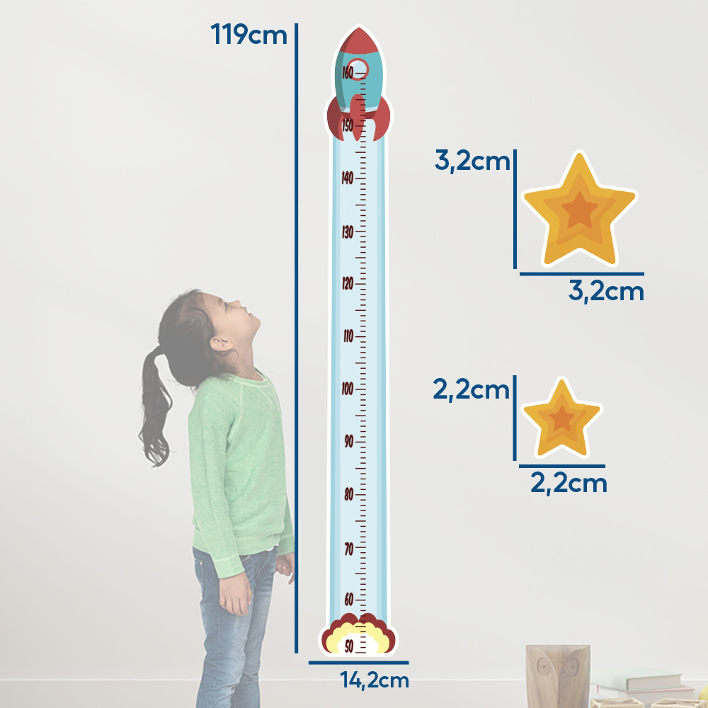 A ARTE NA ARTE AGRADECE A SUA PRESENÇA! Adesivo Parede Régua Foguete Decolagem Exploração Estrelas ESSE PRODUTO CONTÉM: - 1 Folha de Adesivo de Régua tema Foguete e 10 Estrelas; MEDIDAS: - Foguete: 14,2cm de largura X 119cm de comprimento; - Estrela Grande: 3,2cm de largura X 3,2cm de comprimento; - Estrela Pequena: 2,2cm de largura X 2,2cm de comprimento; MATERIAL: - adesivo vinílico fosco não tóxico; TIPO DE IMPRESSÃO: - Impressão em alta resolução livre de imperfeições. OBSERVAÇÕES: - Podem ser colocados nas paredes do Banheiro ou no Box, além do quarto das crianças, na sala de estudos, no escritório, na geladeira, na sala de brinquedos ou em muitos outros lugares. - A aplicação é muito simples, é só tirar o adesivo e colar como quiser. - O Adesivo já seguem com o recorte para agilizar e facilitar sua instalação, cortes feitos com alta precisão no momento da impressão para garantir a melhor qualidade. - Podem ser aplicados em paredes lisas, com tinta acetinada, latex e acrílica, móveis, espelhos, portas, box de banheiro, livres de poeira ou pó de gesso. Não aplicar sobre tinta fresca, tinta magnética, superfícies irregulares ou texturizadas, locais com infiltrações. * Imagem ambiente ilustrativa PRODUTO NÃO TOXICO