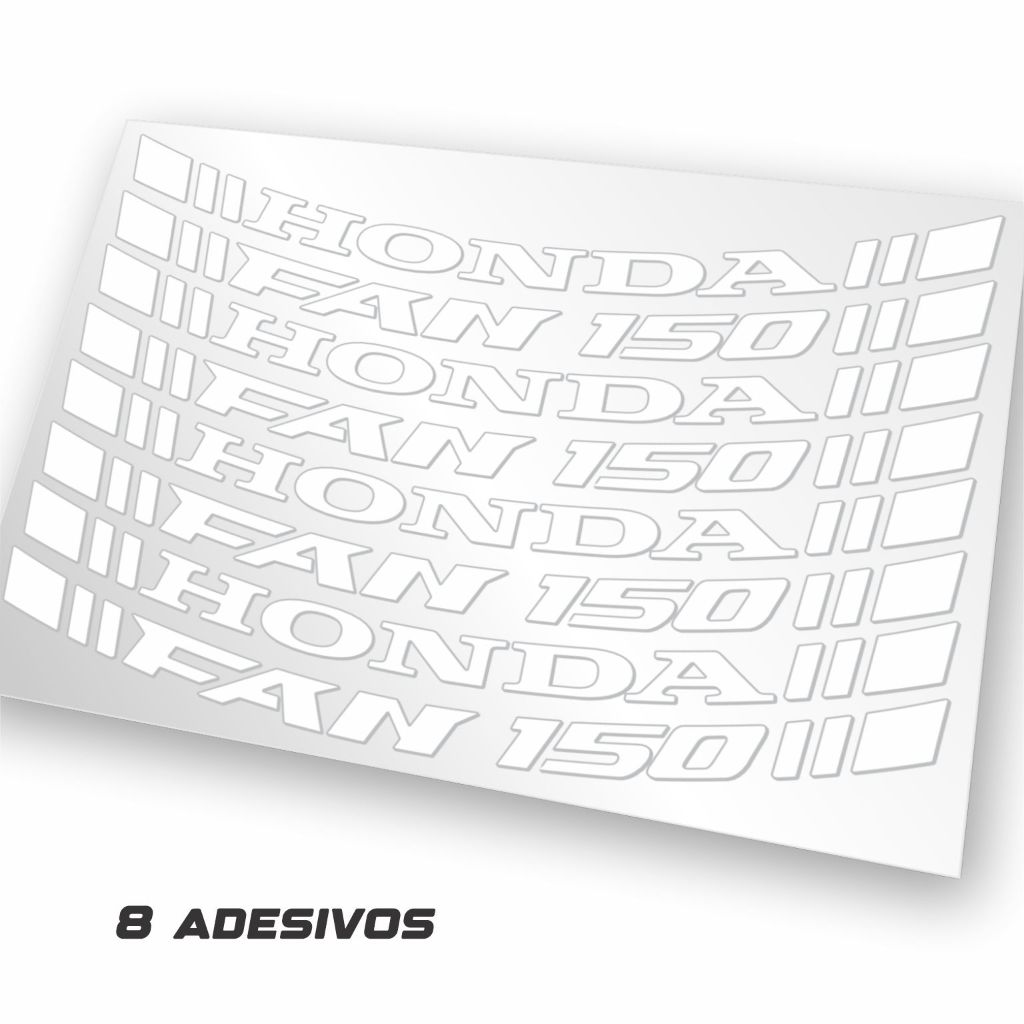 Este produto é personalizado e de fabricação própria, mas possui as medidas e o formato ideais para a aplicação em FAN 150 todos os anos ADESIVO HONDA FAN 150 cor Branco Não Refletivo ENCAIXE PERFEITO, NÃO ESTRAGA A RODA SE UM DIA DESEJAR TIRÁ-LOS. Compatível com: CG150 FAN liga leve de preferência INFORMAÇÕES TÉCNICAS: -Cor Branco (Não Refletivo) (consulte para outras cores) -Adesivo Vinílico Brilho -Lavável -Não precisa de cola, pois é autocolante -Não precisam de verniz COMO APLICAR? -Limpeza: Primeiro faça uma limpeza completa na área onde serão aplicados os adesivos, para que a mesma fique livre de qualquer tipo de impureza, tais como: poeira, óleo, graxa, cera, silicone e etc. Não encere. -Aplicação: Tome tempo, faça na calma! Depois da moto limpa e seca, recorte com a tesoura os adesivos individualmente. Em seguida, retire os adesivos de sua proteção (Liner). Comece a colagem da parte inferior para a superior esticando levemente e apertando com os dedos, tirando as microbolhas até o final. Aconselha-se aguardar um período de 48 horas para a cura total da cola, evitando neste período: lavagem ou exposição excessiva ao sol. Evite cutucar os cantinhos.