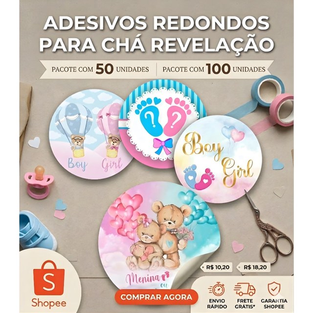 **Adesivo Chá Revelação Personalizado – 4x4cm** Deixe seu chá revelação ainda mais especial com nossos adesivos personalizados! Produzidos em **vinil adesivo de alta qualidade**, já vão **recortados em formato redondo**, prontos para uso. ✨ **Detalhes do produto:** * Tamanho: **4x4cm** * Impressão em papel fotográfico glossy * Corte redondo perfeito 📩 **Personalização:** Após a compra, entre em contato via mensagem para enviar os nomes desejados. ⚠️ Caso os nomes não sejam enviados em até **24 horas após a compra**, os adesivos serão produzidos com a opção padrão **“Menino e Menina”**, garantindo que o prazo de envio seja cumprido. 💡 **Perguntas Frequentes:** * **Vocês personalizam com nome?** → Não personalizamos no momento. * **Pode colar na roupa?** → Sim! * **Pode colar em copos de acrílico?** → Sim! * **Quantos adesivos vêm nesse anúncio?** → A quantidade está informada na seleção do produto. 🛡️ **Garantia e Envio:** * Enviamos todos os produtos muito bem embalados. * Garantia de **troca/devolução em até 30 dias** após o recebimento. Equipe Allu Brindes agradece a sua atenção em nosso anúncio. Boas Compras!