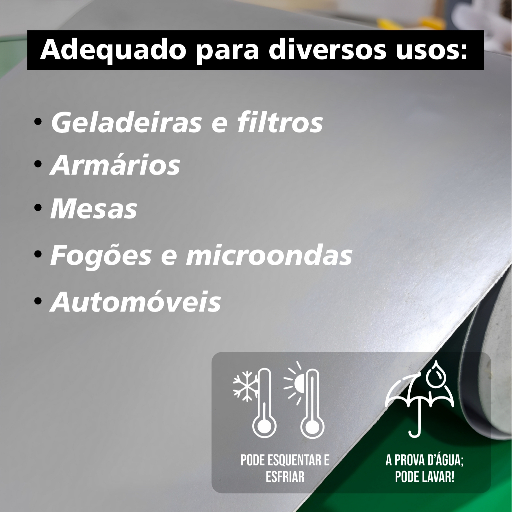PELÍCULA ADESIVA PRATA INOX – LESTEPLASTIC Transforme e renove seus ambientes com a Película Adesiva Prata Inox, ideal para dar um toque moderno e sofisticado em móveis e eletrodomésticos. Fácil de aplicar, limpa e durável, ela é perfeita para quem busca praticidade e elegância na decoração. 📏 TAMANHOS: - 10m x 30cm - 10m x 50cm (Comprando 2 unidades ou mais do de 10m x 50cm, enviamos o material em rolo contínuo, sem cortes — Ex: 2 unidades = 20 metros x 50cm) MARCA LESTEPLASTIC – qualidade e acabamento profissional garantido. Duração com estimativa de até 5 anos *A durabilidade pode variar conforme a técnica de aplicação e cuidados de conservação.* 🧰 ONDE PODE SER APLICADA • Ideal para qualquer superfície lisa e limpa, como: • Geladeira • Fogão • Micro-ondas • Mesas e bancadas • Notebooks • Paredes lisas • Armários e guarda-roupas • Móveis em geral e eletrodomésticos ⚠️ PRECAUÇÕES - Faça a limpeza com pano úmido e água apenas. - Não utilize produtos químicos ou abrasivos. - Evite aplicar em superfícies com mofo, umidade, infiltrações ou textura rústica. - Em áreas externas, mantenha o local coberto para evitar chuva direta. - Se a parede foi pintada recentemente, aguarde no mínimo 10 dias antes da aplicação. - Pode haver variação de tonalidade (até 15%) em compras realizadas em períodos diferentes. 🧼 RECOMENDAÇÕES DE APLICAÇÃO Limpe a superfície com álcool isopropílico para eliminar impurezas e oleosidade. Aplique em superfícies lisas e planas. Após a aplicação, evite produtos agressivos e atritos constantes. Para manter o brilho e aparência, use apenas sabão neutro e pano macio.