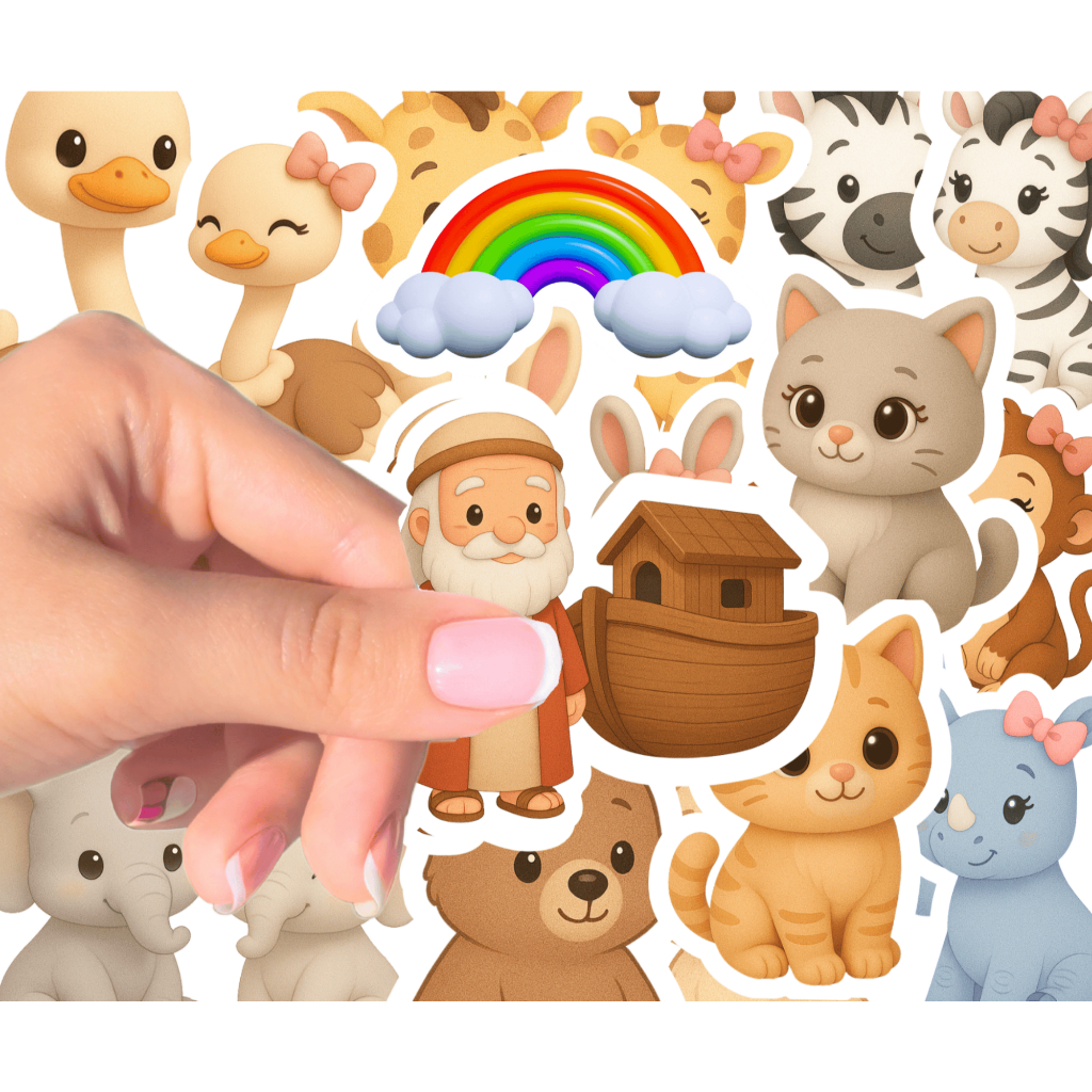 🕊️ Adesivos Arca de Noé — 37 Unid. | Cartela Infantil com Noé, Arca e Animais — Decoração Cristã, Brindes, Lembrancinhas