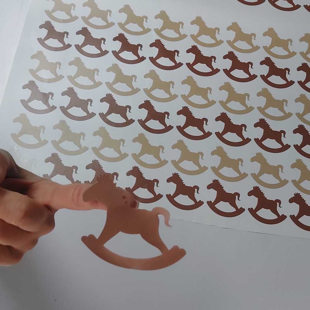 Esse kit é formado por: - 100 cavalos de balanço de 7cm em 2 tons de marrom claro. JÁ CHEGAM PRONTOS PARA COLAR! ATENÇÃO: As imagens são ilustrativas e podem ter sido ampliada para melhorar a visualização dos adesivos. Verifique sempre as dimensões do produto. Transforme qualquer ambiente da sua casa de uma forma fácil, rápida e sem sujeira! É só destacar e colar onde você desejar! - QUAL A QUANTIDADE PRECISO PARA MINHA PAREDE? 1 kit com 100 unidades é suficiente para cobrir, em média, uma parede de 4m2. - COMO DEVO APLICAR MEU ADESIVO? Limpe a superfície a ser usada; Retire, um a um, os adesivos do liner e aplique como desejar (Se preferir use gabarito que enviamos!). Evite superfícies empoeiradas, texturizadas, porosas, jateadas, magnetizadas ou com infiltração. QUANTO MAIS LISA MELHOR! - POSSO APLICAR EM AMBIENTE EXTERNO? Pode sim! Nossos adesivos são feitos em vinil de alta qualidade e suportam muito bem condições externas, como chuva e sol diretos. - QUANTO TEMPO MEU ADESIVO IRÁ DURAR NA MINHA PAREDE? Nossos adesivos tem uma durabilidade de 5 anos. TODOS OS ADESIVOS VÃO RECORTADOS UM A UM E SÃO AUTOCOLATES! Qualquer dúvida, nossa equipe está à sua disposição!