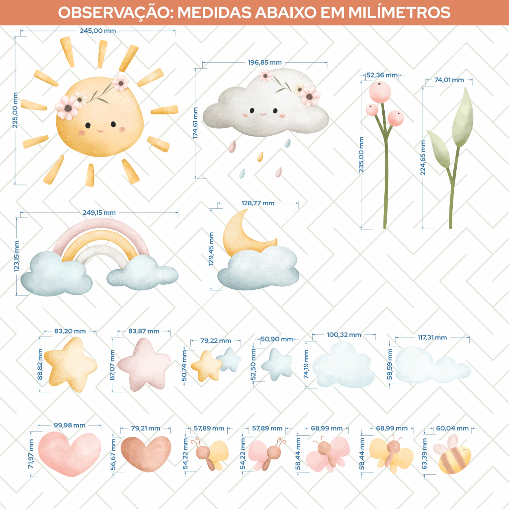 Adesivos de Parede Infantil Boho Aquarela Decoração Quarto Bebê – Sol, Nuvens, Flores e Corações