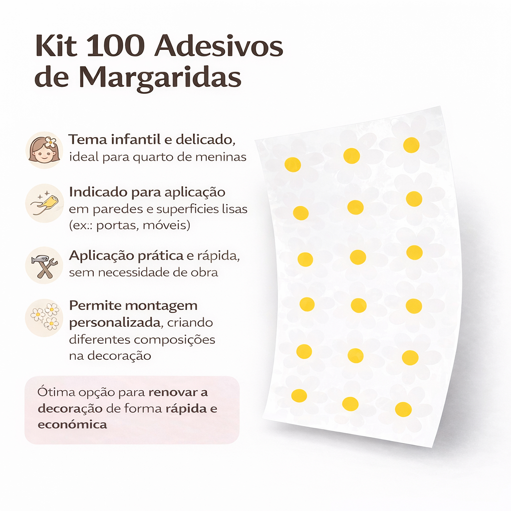 🌼 Kit Adesivos de Parede Margaridas Infantil – Quarto de Meninas 🌼 Transforme o quarto infantil em um ambiente delicado, alegre e encantador com o Kit de Adesivos de Parede Margaridas. Ideal para quem busca uma decoração suave e atemporal, esse kit é perfeito para quartos de meninas, trazendo leveza, charme e um toque de natureza ao espaço. ✨ Destaques do produtos Design delicado de margaridas, ideal para decoração infantil Estilo neutro, combina com diversos temas e cores de quarto Visual alegre que deixa o ambiente mais aconchegante Excelente opção para renovar o espaço sem obras ou sujeira 🧸 Fácil aplicação: Os adesivos são autocolantes, prontos para aplicar. Basta destacar e colar na parede lisa e limpa. Não é necessário cola extra, ferramentas ou mão de obra especializada. 🏡 Onde usar: Quarto infantil feminino Cantinho de brincar Brinquedoteca Parede de destaque ou cabeceira 📦 Conteúdo do kit: Cartela com adesivos decorativos de margaridas Produto enviado pronto para uso 💡 Benefícios: Decoração rápida e prática Não danifica a parede quando removido corretamente Ideal para quem busca beleza com ótimo custo-benefício 🌸 Perfeito para deixar o quarto mais doce, alegre e acolhedor, estimulando o bem-estar e a imaginação das crianças.