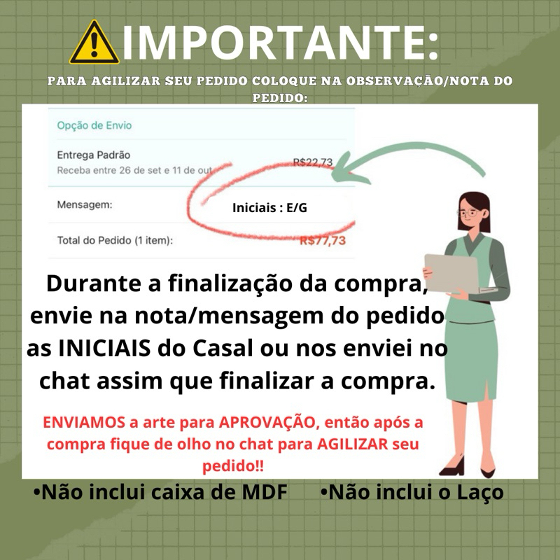⚠️NÃO COMPRE mais de UM KIT por pedido(EX: precisa de 20 unidade e pegar dois kits de 10) Solicite a quantidade necessária pelo chat que enviaremos o link✨ 💚Após a compra envie IMEDIATAMENTE as iniciais do Casal e opção de arte escolhida! Material : Papel Fotográfico Glossy É só DESTACAR e COLAR!! ⚠️IMPORTANTE! - O fundo NÃO é TRANSPARENTE, o fundo vai estampado imitando MDF ou na cor BRANCA caso sua caixa seja pintada de branco. SOBRE AS ARTES: - NÃO criamos outras artes além das que estão no anúncio, pode escolher uma das 50 opções ou nos enviar sua arte já pronta para impressão(enviar mensagem no chat antes da compra que explicamos certinho como enviar a sua arte). - Neste anúncio NÃO colocamos nomes de padrinhos na arte, colocamos apenas as iniciais dos noivos e data, ou nome dos noivos e data! - Caso queira por os nomes dos padrinhos nas artes solicite no chat o anúncio que vai incluso os nomes que te enviaremos! - Clique em adicionar ao carrinho para selecionar a quantidade desejada e caso precise de uma quantidade diferente solicitar pelo chat.
