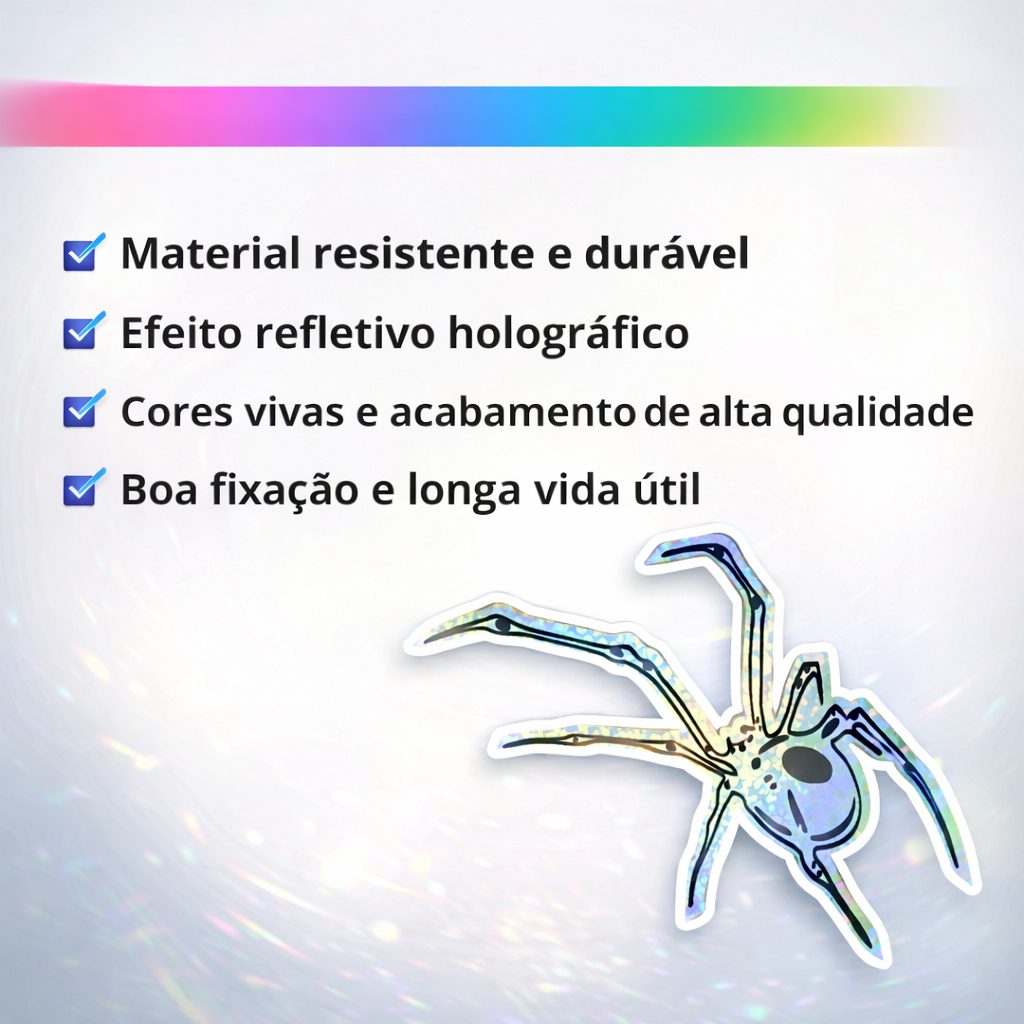 O adesivo refletivo holográfico Aranha é ideal para personalização e destaque visual em diversos tipos de superfícies. Com acabamento brilhante e efeito holográfico, oferece excelente visibilidade, inclusive em ambientes com pouca luz. Perfeito para quem deseja estilo, personalidade e segurança visual em veículos ou objetos pessoais. Medidas: 10 cm x 7 cm Diferenciais: - Material resistente e durável - Efeito refletivo holográfico - Cores vivas e acabamento de alta qualidade - Boa fixação e longa vida útil Aplicação Pode ser aplicado em superfícies limpas e lisas como: - Carros, caminhões, ônibus e motos - Tanques de moto e capacetes - Bicicletas - Vidros e janelas - Smartphones e objetos pessoais Para melhor aderência, aplique sobre superfície limpa e seca.