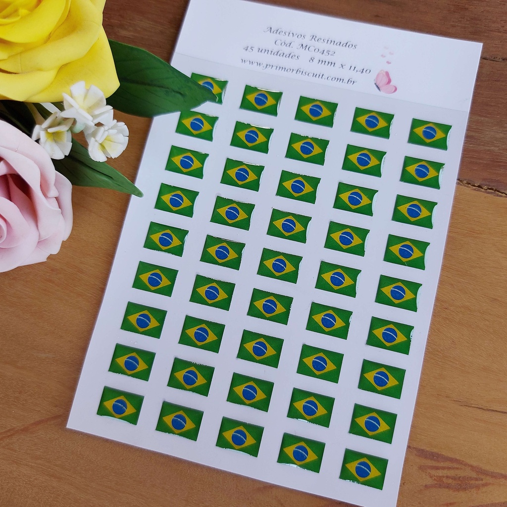 Adesivos Resinados – MC0452 - Bandeira do Brasil Retângulo com 8mm x 11,4mm Cada cartela contem 45 unidades Caso queira algum tamanho diferente, entre em contato que fazemos personalizado Cartela com adesivos em vinil (já recortados) com uma camada em relevo de resina de alta qualidade. Com proteção UV e à prova d'água. Ideal para peças em Biscuit, EVA, Feltro, Amigurumi, Papel, Tecido e o que a imaginação mandar. Caso queira outros modelos e tamanhos, pode nos consultar