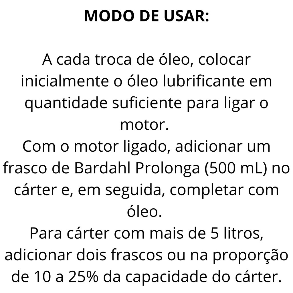 Aditivo para cárter de motores cansados, que apresentem problemas de vazamento de óleo ou fumaça excessiva. BARDAHL PROLONGA -Aumenta a vedação do lubrificante, reduzindo vazamentos -Controla a fumaça da queima e melhora a eficiência do motor -Diminui a emissão de poluentes -Restaura a potência evitando passagem excessiva de óleo -Proteção contra oxidação com menor consumo de óleo -Reduz o desgaste das peças móveis, aumentando a durabilidade do motor Aplicação: Cárter de veículos com motores movidos a gasolina, etanol, diesel e GNV. Benefícios: Aumenta a viscosidade: aumenta a película vedadora do lubrificante controlando a fumaça da queima. Condiciona juntas, selos e retentores, reduzindo vazamentos de óleo. Reduz a emissão de poluentes, pois evita a passagem excessiva de óleo lubrificante pelos anéis e guias de válvulas, restaurando assim a potência do motor. Antioxidante: aumenta consideravelmente a vida útil do óleo lubrificante, evitando a perda das características antes do tempo. Protege todas as peças do motor contra oxidação e reduz o consumo de óleo lubrificante. Antidesgaste: prolonga a vida útil do motor, reduz o desgaste das peças, os custos com manutenção nas revisões periódicas e o consumo de combustível, pois o motor trabalha mais livre devido à excelente lubrificação. Resiste às mais elevadas pressões e temperaturas, garantindo perfeita lubrificação sob todas as condições de funcionamento. Aprovado na sequência IIIF: é um teste de classe mundial, com padrões extremamente severos, que avalia alterações do óleo lubrificante, tais como o aumento de viscosidade e o consumo, formação de depósito e desgaste nas peças do motor. Modo de uso: A cada troca de óleo, colocar inicialmente o óleo lubrificante em quantidade suficiente para ligar o motor. Com o motor ligado, adicionar um frasco de 500ml no cárter e, em seguida, completar com óleo. Para cárter com mais de 5L, adicionar dois frascos ou na proporção de 10 a 25% da capacidade do cárter. Compatível com: Base Mineral, Base Sintético, Base Semissintética Trata até: 5 L Contém: 500ml - Bardahl TUDO ANDA BEM COM BARDAHL! .