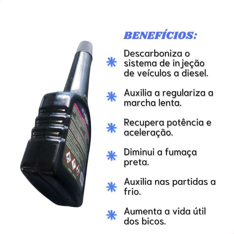Aditivo Diesel Motor Limpeza Completa Combustível Sistema de Injeção STP 5 em 1 Limpador De Bicos E Bomba Injetora O Aditivo Diesel STP 5 em 1 é uma solução avançada projetada para a limpeza e manutenção do sistema de combustível do seu veículo a diesel. Este produto multifuncional proporciona uma limpeza completa do motor, incluindo bicos injetores e bomba injetora, garantindo um desempenho otimizado e prolongando a vida útil do sistema de injeção. Este produto é para retirar todas as impurezas contidas no sistema de alimentação de combustível que possam estar impedindo ou dificultando a passagem correta do combustível para o motor. Este processo executa a limpeza desde o tanque de combustível até o escapamento de uma forma progressiva, rápida e eficaz. Deve ser repetido a cada revisão ou 10.000Km para uma manutenção preventiva, evitando assim possíveis problemas nos componentes do sistema de combustível. Itens incluso na embalagem: 01 Aditivo Diesel Especificações: Marca: SPT Código do produto: 3330 Motores: Diesel BENEFÍCIOS: * Limpa os bicos injetores; * Lubrifica e limpa a bomba injetora de Diesel; * Limpa progressivamente válvulas de admissão, sedes de válvula e câmara de combustão; * Aumenta a vida útil do motor; * Trata todo o sistema desde o tanque de combustível; * Restaura a potência do motor; * Melhora a aceleração e controle de marcha lenta; * Reduz a emissão de poluentes; * Reduz o consumo de combustível; * Contém Anti Espumante; * Dispersa partículas de água; * Otimiza a combustão; * Previne contra corrosão e oxidação.
