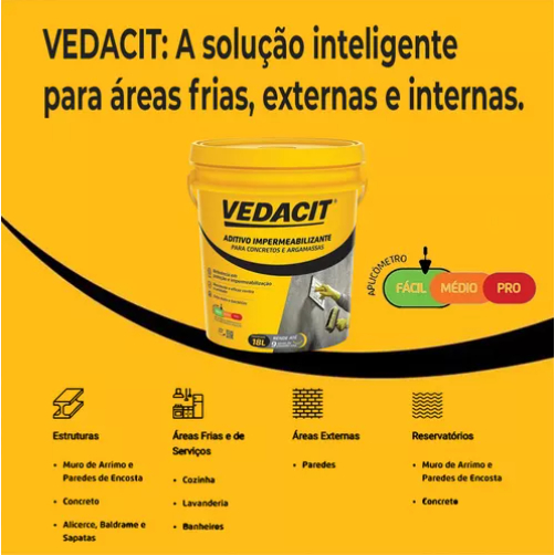 | Aditivo Impermeabilizante Vedacit (Balde 18 litros) - VEDACIT - Con... | R$ 44,90 | 36% | 4.9/5 | 284 |