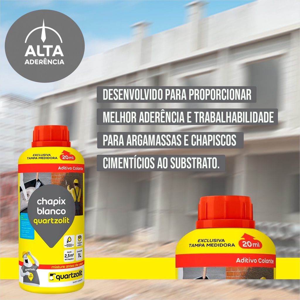 chapix blanco quartzolit chapix quartzolit é um aditivo adesivo à base de PVA, desenvolvido para proporcionar melhor aderência e trabalhabilidade para argamassas e chapiscos cimentícios ao substrato. • Chapiscos rolados e comuns • Alta aderência • Isento de cloreto, não agride a armadura • Aplicação sobre concreto, alvenaria e bloco de EPS em tetos de lajes. Cor: líquido branco leitoso Alta resistência Alta aderência Pronto para uso Suporte Fundação e Alicerce Características e Benefícios • Facilita a aplicação do chapisco rolado, reduzindo as perdas de material e a geração de sujeira na obra. • Diminui a retração e a permeabilidade de chapiscos e argamassas. • Aumenta a coesão das argamassas. • Reduz a fissuração em argamassas de revestimento. • Pronto para o uso.