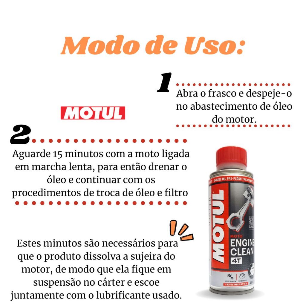ENGINE CLEAN 4T MOTUL 200ML Mantenha seu óleo limpo e novo por mais tempo, utilize o Engine Clean Motul Aditivo para a limpeza do motor. Ideal ser utilizado antes da troca de óleo. Feito para realizar a limpeza do circuito de lubrificação do motor e transmissão das motocicletas - Restaura a compressão do motor eliminando lamas, depósitos de fuligem e vernizes. Protege o motor: mantém o óleo novo e limpo por mais tempo. Indicado para: Motores 4 Tempos de Motos ATVs, UTVs, Jet Skis e Snowmobiles. Benefícios: - Diminui o desgaste e o consumo de combustível e óleo. - Reduz a emissão de poluentes - Extrai o máximo benefício do óleo novo após a troca - Aumenta a durabilidade do calisador Modo de Uso: 1- Abra o frasco e despeje-o no abastecimento de óleo do motor. 2- Aguarde 15 minutos com a moto ligada em marcha lenta, para então drenar o óleo e continuar com os procedimentos de troca de óleo e filtro. Estes minutos são necessários para que o produto dissolva a sujeira do motor, de modo que ela fique em suspensão no cárter e escoe juntamente com o lubrificante usado. Um frasco trata até 5L de óleo, sendo passível de aplicar em todas as motocicletas 4T. Qua a importância da manutenção preventiva? A manutenção preventiva é muito importante para que a sua moto continue com um bom desempenho e você esteja sempre seguro ao pilotar.