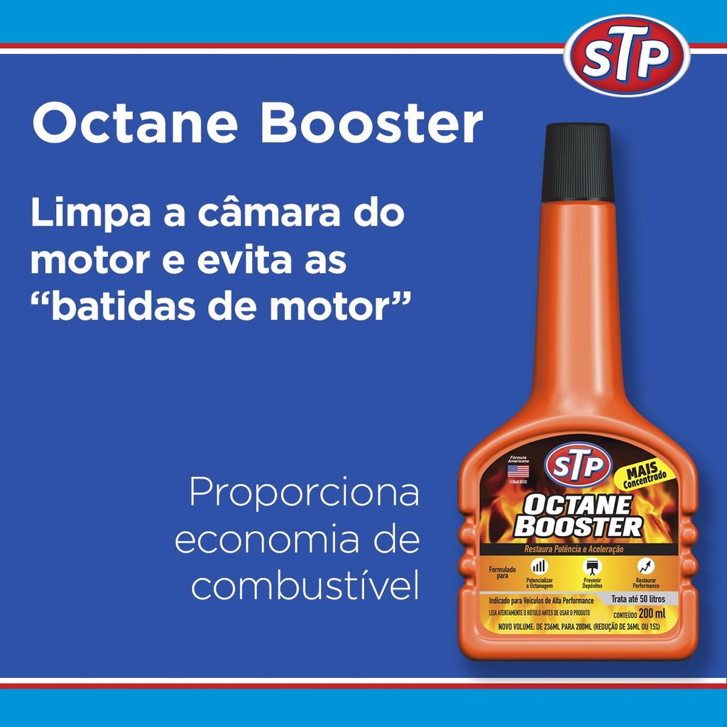 INFORMAÇÕES GERAIS: Contém: 02 frascos com 200ml Modelo: ST-2090BR DESCRIÇÃO O STP OCTANE BOOSTER aumenta a octanagem da gasolina, evita as “batidas do motor”, limpa a câmara de combustão e proporciona economia de combustível. Pode ser utilizado em etanol para limpeza do sistema. MODO DE USAR Use um frasco para tratar até 40 litros de gasolina comum ou aditivada. BENEFÍCIOS 1° Restaura a potência e reduz o consumo de combustível; 2° Tratamento para motores a gasolina, potencializador de octanagem; 3° Auxilia na limpeza da câmara de combustão e do sistema de admissão; 4° Evita a pré-detonação (batida de pino) e facilita a partida; 5° Mantém a regulagem do motor, melhora o desempenho e reduz consumo; 6° Possibilita combustão homogênea, sem resíduos; 7° Potencializa retomadas de velocidade e propicia maior vida útil para o motor.