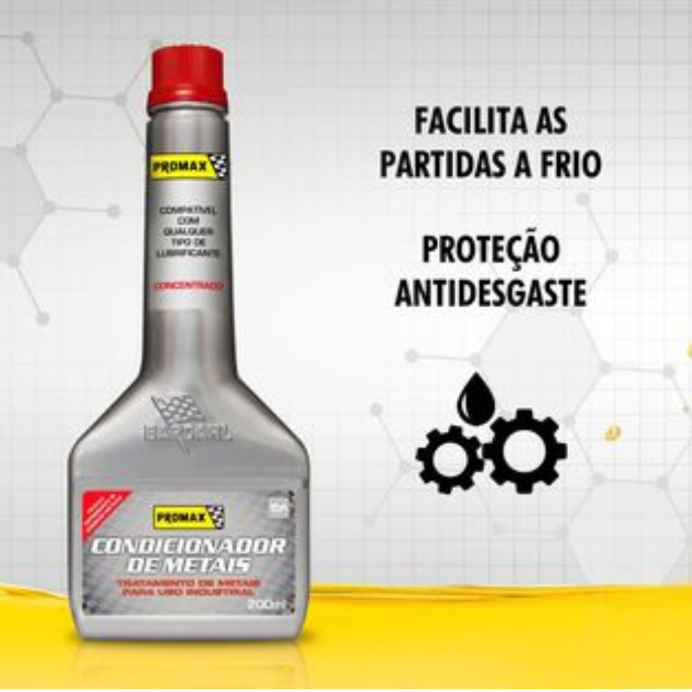 O novo Promax Condicionador de Metais é um produto concentrado! Um frasco de 200 ml trata até 5L de lubrificante e é compatível com qualquer tipo de lubrificante, de qualquer viscosidade. A barreira de proteção contra o desgaste é formada quando o produto Promax Condicionador de Metais é adicionado ao lubrificante, encontra pontos críticos de fricção É muito eficaz nos momentos em que o atrito é maior, por exemplo, no início de operação dos equipamentos (partidas a frio), e continua agindo em situação de atrito fluído (durante o trabalho do equipamento). O Promax Condicionador de Metais está focado na redução de atrito, sendo que seus outros benefícios, como a ação antioxidante e antitravamento, são consequências da proteção extrema contra o atrito. A redução do atrito que este produto proporciona traz economia de energia motriz, que resulta em economia de combustível, e remove calor da superfície do metal, o que previne travamentos e oxidação do lubrificante. O princípio de proteção às peças metálicas do Promax Condicionador de Metais é similar ao de outro produto, o aditivo Bardahl B12 Plus, que, além da proteção antidesgaste, oferece outros benefícios, como detergência, dispersância, resistência à oxidação e corrosão e melhorador do índice de viscosidade. Foi desenvolvido com todo o know how da Promax Bardahl, empresa que há 61 anos entrega aos consumidores produtos de comprovada qualidade. Contém: Frasco de 200ml .