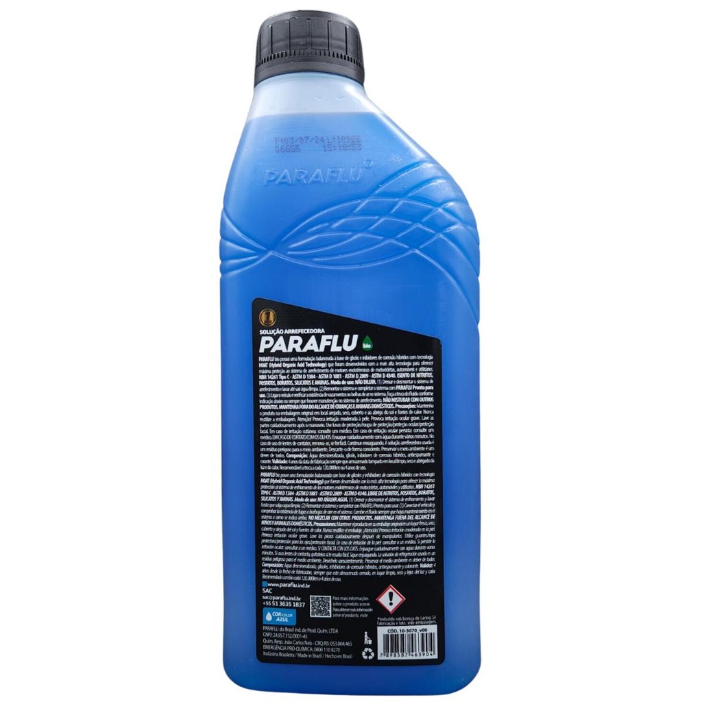 SKU: 16700031 / NUM.PEÇA: 10-3070 VALOR REFERENTE Á: 1 LITRO PARAFLU BIO HÍBRIDO PRONTO PARA USO. A solução arrefecedora Paraflu Bio Híbrido Pronto para usar possui uma formulação balanceada a base de Glicol e inibidores de corrosão híbridos que foram desenvolvidos com a mais alta tecnologia para oferecer máxima proteção para o sistema de arrefecimento de motores endotérmicos de motocicletas, automóveis, utilitários, caminhões, máquinas agrícolas e motores estacionários. Paraflu Bio Híbrido possui a tecnologia Long Life HOAT (Hibrid Organic Acid Tecnology), que aumenta a vida útil do motor lubrificando a bomba d’água, a válvula termostática, evitando o ressecamento das mangueiras e protegendo contra a corrosão todos os tipos de motores. Sua formulação eleva o ponto de ebulição e reduz o ponto de congelamento, protegendo também contra o superaquecimento e o congelamento além de proteger contra a cavitação e não atacar os sensores eletrônicos. Possui propriedade antiespumante e anti-incrustante. Quando utilizado corretamente protege por até 4 anos ou 120.000km. NBR 14261 Tipo C - ASTM D1384 - ASTM D1881 - ASTM D2809 - ASTM D4340 – Híbrido – Pronto para uso – Produto ecologicamente correto – Biodegradável – Matéria prima de fontes renováveis – Produzido com água desmineralizada – Cor: Azul – Diluição: Não diluir! Produto já pronto para aplicação Este produto possui 50% de aditivo concentrado e 50% de água desmineralizada.