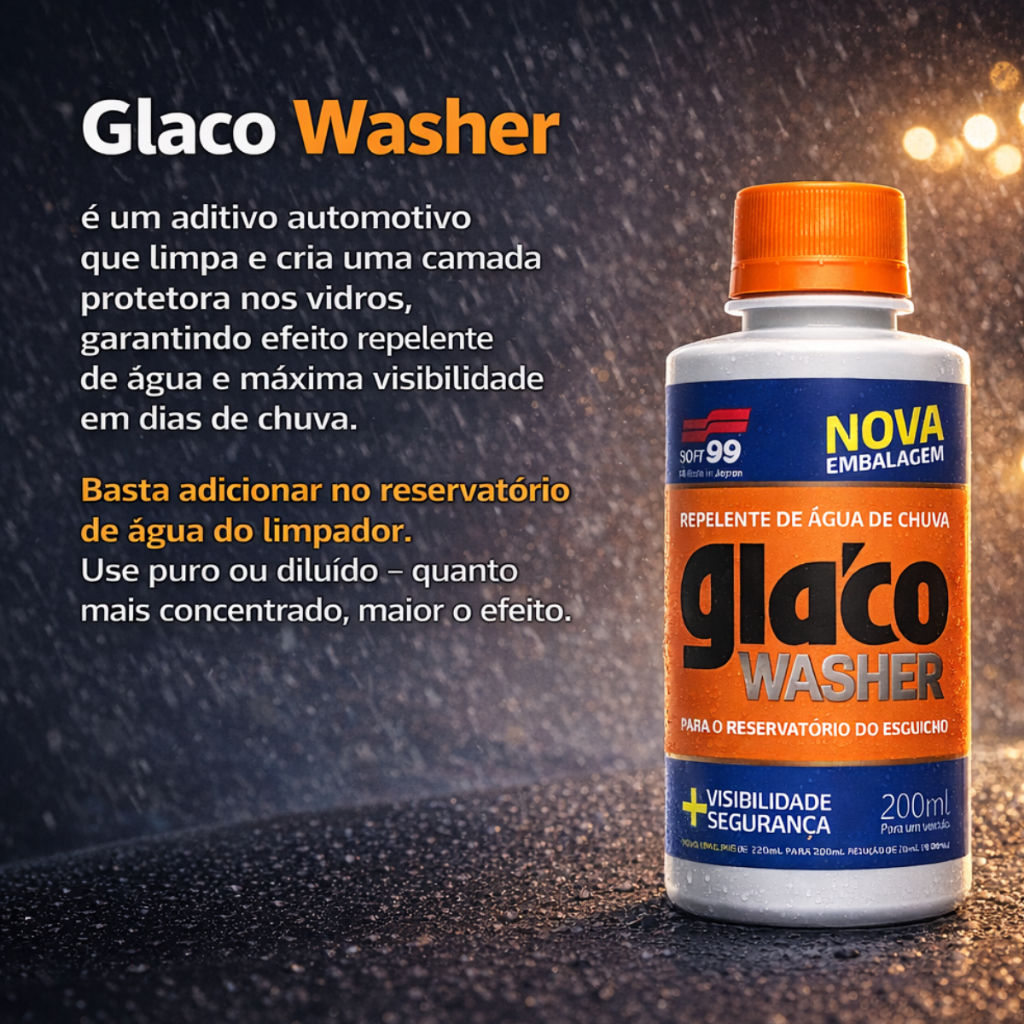 O Aditivo Repelente de Água Glaco Washer Soft99 200ml é o produto ideal para quem deseja maior visibilidade e segurança ao dirigir em dias de chuva, mantendo o para-brisa do carro sempre limpo e com desempenho máximo do limpador. Este aditivo automotivo é desenvolvido especialmente para ser adicionado diretamente ao reservatório do limpador de para-brisa, criando uma camada hidrofóbica de proteção que faz com que a água deslize rapidamente, melhorando a visibilidade e garantindo segurança ao dirigir. O Glaco Washer Soft99 200ml oferece benefícios que vão além da simples limpeza do vidro: ele repelente de água automotivo protege contra respingos, chuva intensa, sujeira, oleosidade e insetos, garantindo que o vidro permaneça limpo por mais tempo. É compatível com outros produtos cristalizadores Glaco, permitindo reforço da proteção e prolongando a durabilidade do efeito hidrofóbico. Visibilidade superior em qualquer condição climática, mesmo sob chuva forte ou respingos de lama Limpeza eficaz contra sujeira, oleosidade, poeira e insetos Efeito repelente imediato, fazendo a água deslizar facilmente sem prejudicar a visibilidade Compatível com outros produtos Glaco, permitindo combinação com cristalizadores automotivos para máxima proteção Fácil aplicação, direto no reservatório do limpador de para-brisa, sem necessidade de adaptações ou ferramentas especiais Produto original Soft99, referência mundial em qualidade e durabilidade para carros Como aplicar: - Abra o reservatório do limpador de para-brisa do seu carro - Adicione todo o conteúdo do frasco de 200ml do Glaco Washer Soft99 - Pode ser usado puro ou diluído com água limpa, conforme necessidade - Acione o limpador para espalhar o produto pelo vidro e observar o efeito hidrofóbico - Pronto! O para-brisa agora terá proteção contra água e sujeira, aumentando a segurança ao dirigir Conteúdo da embalagem: - 01 Aditivo Glaco Washer Soft99 – 200ml original Soft99 - Por que escolher o Glaco Washer Soft99: - Produto original japonês, confiável e de alta qualidade - Fácil aplicação, sem complicações, pronto para uso imediato - Segurança e conforto ao dirigir, mesmo em dias de chuva, tempestade ou neblina - Durabilidade do efeito hidrofóbico, proporcionando menos necessidade de limpeza constante - Produto 100% compatível com carros nacionais e importados, mantendo a performance do limpador - Garantia de qualidade premium Soft99, líder mundial em produtos automotivos de cristalização Dúvidas comuns: - Enviamos NF-e: você recebe nota fiscal oficial, garantindo segurança e procedência do produto - Produto original Soft99: não é genérico ou importado sem referência, garantindo alta qualidade - Compatível com qualquer carro: funciona em todos os tipos de reservatórios de limpador de para-brisa - Aplicação fácil e rápida: não exige instalação complexa ou ferramentas adicionais - Efeito imediato e duradouro: você sente a diferença já na primeira aplicação, e o efeito protege por semanas - Sem riscos de danificar o vidro: o produto é formulado para uso seguro em para-brisas e vidros automotivos Palavras-chave integradas: aditivo repelente de agua glaco washer soft99 aditivo automotivo repelente chuva vidro carro cristalizador para-brisa vidro automotivo limpador automotivo protecao hidrofobica visibilidade chuva limpeza vidro carro efeito repelente produto original soft99 facil aplicacao 200ml para-brisa carro seguranca dirigir chuva repelente agua automotivo