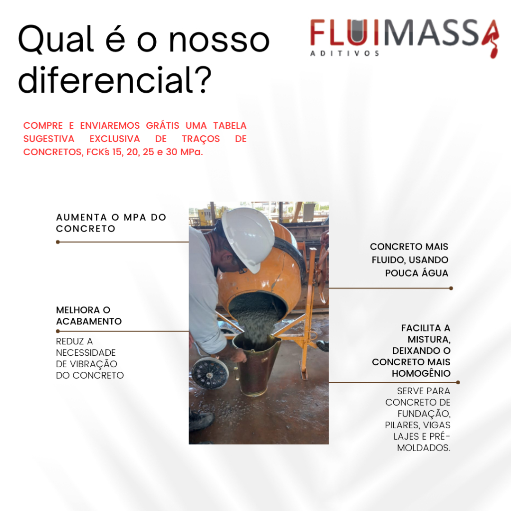 ATENÇÃO!!!! COMPRE APENAS 1 POR VEZ!!!! O FLUIMASSA 150 é um aditivo superplastificante para concreto, à base de policarboxilato. É classificado pela ABNT NBR 11768 como sendo P. A FUNÇÃO DO FLUIMASSA 150, é deixar seu concreto fluido sem a necessidade de adição de muita agua, aumentando assim muito, a resistencia à compressão. O FLUIMASSA 150, reduz a quantidade de agua, aumenta a resistência em MPa, melhora o acabamento, diminui a porosidade, reduz a necessidade de vibração, deixa o concreto com a superficie lisa após a secagem, acelera o processo de secagem e facilita a aplicação. Você irá fazer um concreto parecido com usinado, podendo fazer pequenas quantidades e com qualidade garantida. Facilita a mistura do concreto, deixando-o mais uniforme, com maior produção e menor custo. Aumenta o slump do concreto, deixando-o mais fluido. Não contém cloretos ou qualquer outro produto que possa causar corrosão ao aço. Aumento de Resistência e Flexão. APLICAÇÕES: Qualquer tipo de concreto e argamassa. •Concreto virado em obra. •Concretos bombeáveis e tradicionais. • Concreto pré-moldado; • Concreto para sistema de paredes modulares de concreto; • Concreto autoadensável (CAA); • Concreto de auto desempenho (CAD); • Concreto aplicado a baixas temperaturas (inverno). • Concretos para fundações, vigas, lajes, pilares, muro de arrimo, calçadas e qualquer outro que você desejar. O FLUIMASSA 150 É um produto muito versátil e completo. MODO DE USAR • O Fluimassa 150 é um aditivo que já vem pronto . A dosagem varia em torno de 200ml para cada saco de cimento de 50 Kg. Dependendo da fluidez desejada. Ou variando de 0,1 a 0,6% sobre a massa de cimento. Por exemplo, para um concreto de calçada ou contra-piso, que requer uma baixa fluidez, usar 100ml de aditivo para cada saco de cimento. Para um concreto estrutural de viga, pilar ou lajes, usando 200ml por saco de cimento, deixará o traço bem fluido, parecido com concreto auto-adensável com slump (fluidez) em torno de 23cm. AO FAZER SUA COMPRA, SE PRECISAR SOLICITE-NOS, QUE ENVIAREMOS GRATIS UMA TABELA SUGESTIVA EXCLUSIVA DE TRAÇOS DE FCK´s 15, 20, 25 e 30 MPa, PARA SERVIR COMO PONTO DE PARTIDA. ATENÇÃO!!!!!!! * OS TRAÇOS E AS RESISTÊNCIAS PODERÃO VARIAR PARA MAIS OU MENOS CONFORME AS CARACTERISTICAS DOS MATERIAIS UTILIZADOS. CADA REGIÃO TEM AGREGADOS DIFERENTES. NÃO NOS RESPONSABILIZAMOS POR RESISTENCIAS BAIXAS. SÓ FAZEMOS UMA SUGESTÃO.
