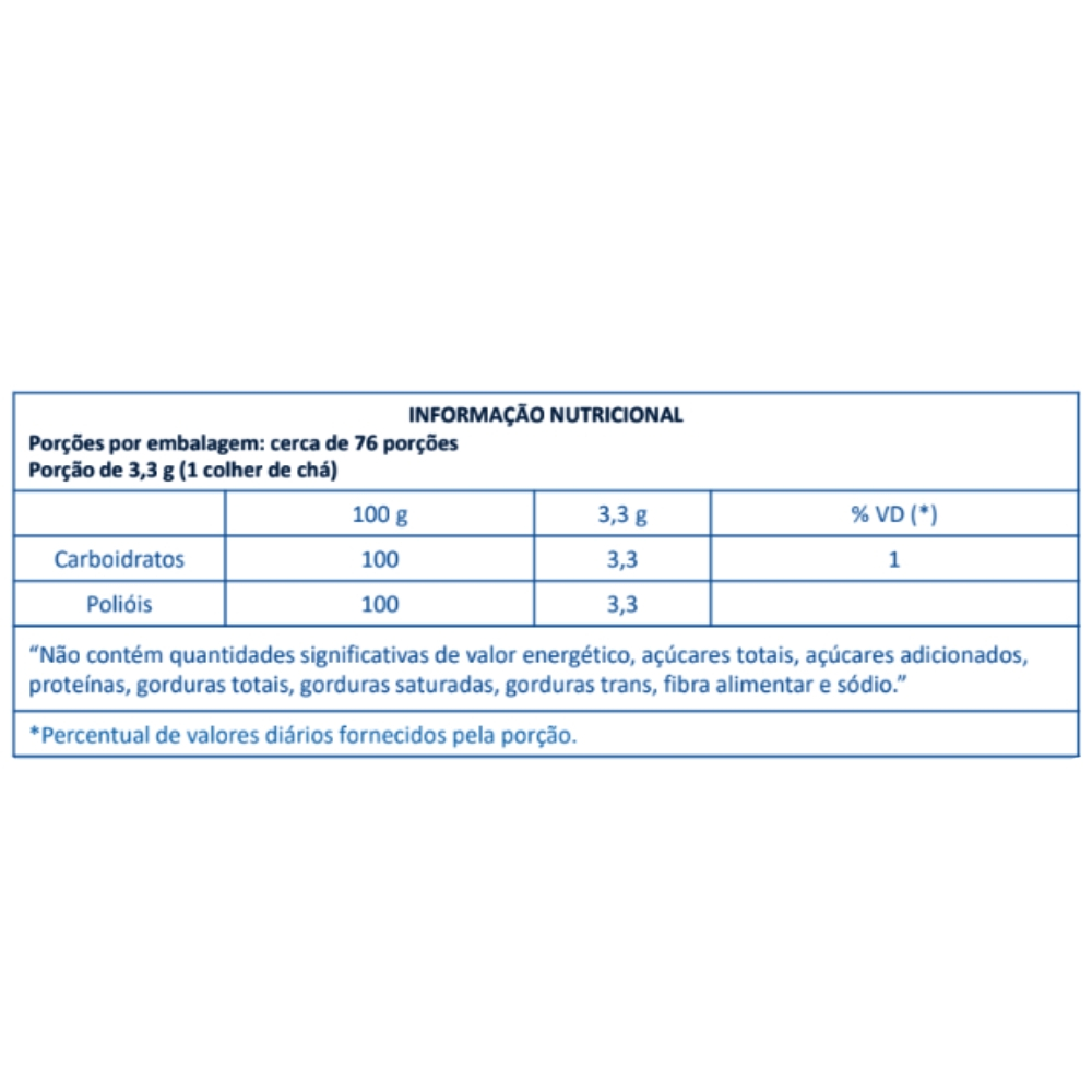 Linea Adoçante Em Pó Culinário Eritritol 100% Natural é um edulcorante derivado do milho, livre de transgênicos, vegano e possui o eritritol como único ingrediente. Com sabor doce, tem 70% do dulçor do açúcar. É zero calorias, não contém glúten, dispõe de ação anticariogênica e atinge ponto de calda para doces. Pode ser consumido por toda a família e 90% é eliminado pelo organismo. A embalagem é feita com barreiras protetoras que reduz o empedramento. O adoçante do consumidor saudável que deseja eliminar o consumo do açúcar de forma natural! INGREDIENTES: Edulcorante natural eritritol. NÃO CONTÉM GLÚTEN.