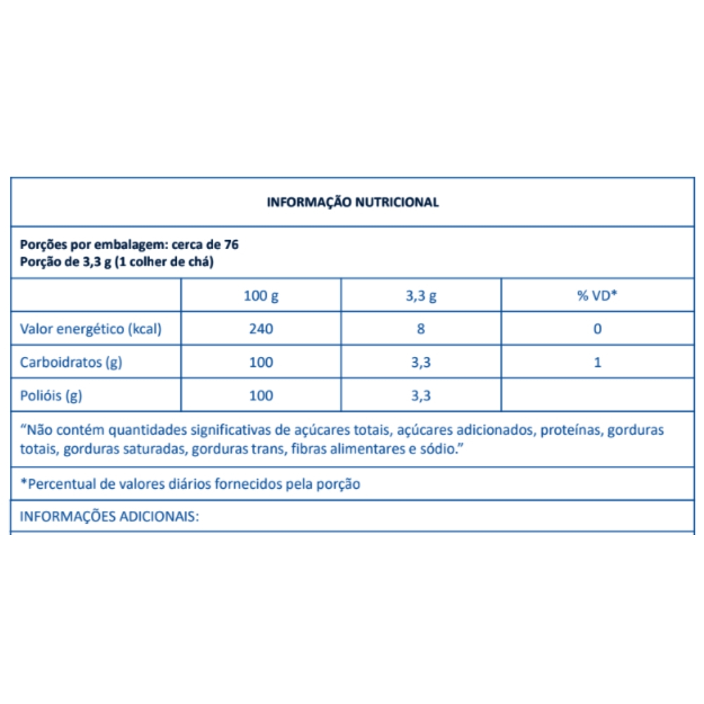 Linea Adoçante Em Pó Xilitol 100% Natural é um edulcorante derivado do milho, livre de transgênicos, vegano, e tem o xilitol como único ingrediente. Com sabor e aparência semelhantes ao açúcar, adoça como o açúcar, com 40% menos calorias e não altera a glicemia como o açúcar. Não contém glúten, dispõe de ação anticariogênica e atinge ponto de calda para doces. Pode ser consumido por toda a família. A embalagem é feita com barreiras protetoras que reduz o empedramento. O adoçante do consumidor saudável que deseja reduzir o consumo de açúcar com naturalidade e praticidade! INGREDIENTES edulcorante natural xilitol. NÃO CONTÉM GLÚTEN.