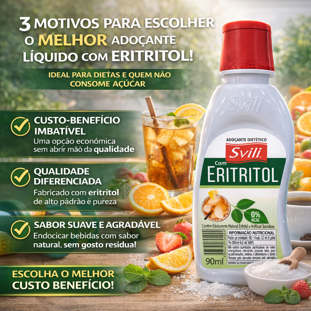 🌟 ADOÇANTE LÍQUIDO COM ERITRITOL SVILI 90ML – ZERO CALORIAS, SEM AÇÚCAR, LOW CARB Imagine poder adoçar seu café, sucos, chás e receitas favoritas sem culpa… Sem açúcar, sem calorias e sem prejudicar sua dieta. O adoçante líquido com eritritol Svili foi desenvolvido para quem busca uma vida mais saudável, mantendo o sabor agradável e natural no dia a dia. ✔ Ideal para dietas low carb e emagrecimento ✔ Perfeito para diabéticos e controle glicêmico ✔ Sabor leve, sem amargor ✔ Pode ser usado em bebidas quentes e frias 👉 A escolha inteligente de quem quer substituir o açúcar sem abrir mão do prazer. Com o eritritol líquido Svili, você tem: ✅ Zero calorias – não interfere na dieta ✅ Índice glicêmico zero – ideal para diabéticos ✅ Alta concentração – rende muito mais ✅ Sabor natural e suave – sem gosto residual ✅ Praticidade – gotas na medida certa Basta algumas gotas para adoçar qualquer bebida ou receita! 📦 INFORMAÇÕES DO PRODUTO Conteúdo: 90 ml Tipo: Adoçante líquido Base: Eritritol + Sucralose Zero calorias Sem açúcar Ideal para dietas e uso diário 💥 7 PERGUNTAS E RESPOSTAS 1. Esse adoçante tem gosto amargo? 👉 Não! Ele possui sabor suave e natural, muito mais agradável que adoçantes comuns. 2. Pode ser usado por diabéticos? 👉 Sim! Possui índice glicêmico zero, ideal para quem precisa controlar a glicose. 3. Ajuda no emagrecimento? 👉 Sim! Por ser zero calorias, ele substitui o açúcar sem atrapalhar sua dieta. 4. Quantas gotas devo usar? 👉 Poucas gotas já são suficientes! É um produto altamente concentrado e econômico. 5. Pode usar em bebidas quentes e frias? 👉 Sim! Funciona perfeitamente em café, chá, sucos e receitas. 6. Esse adoçante é melhor que açúcar? 👉 Sim! Ele oferece doçura sem calorias e sem impacto na glicose, sendo muito mais saudável. 7. Vale a pena comprar esse produto? 👉 Com certeza! Você terá um produto com excelente custo-benefício, alta qualidade e rendimento. 👉 Troque o açúcar hoje mesmo e sinta a diferença no seu corpo e na sua rotina. 👉 Produto ideal para quem busca saúde, sabor e resultado real. adoçante eritritol, adoçante líquido eritritol, adoçante zero calorias, adoçante natural sem açúcar, eritritol líquido, adoçante low carb, adoçante para diabéticos, adoçante fitness, adoçante sem glicose, adoçante saudável