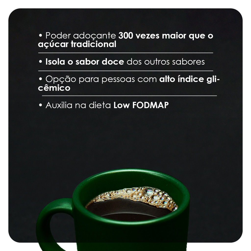 INFORMAÇÕES DE DESTAQUE • Stevia, Taumatina e Eritritol • Zero calorias, zero açúcar, sem sabor amargo ou metálico • Curva de dulçor mais longa, semelhante ao açúcar de cana DESCRIÇÃO O adoçante em sachê da Color Andina é elaborado com uma combinação de Stevia, Taumatina e Eritritol, proporcionando uma alternativa saudável para quem quer adoçar sem calorias ou açúcar. Com um sabor que evita o amargor ou o residual metálico, ele tem um poder adoçante 300 vezes superior ao açúcar comum, ideal para bebidas e receitas. Adoça suavemente, mantendo o dulçor semelhante ao da cana-de-açúcar, sendo adequado para pessoas com alto índice glicêmico e compatível com a dieta Low FODMAP, realçando o sabor doce sem interferir nos demais sabores dos alimentos. COMPOSIÇÃO Glicosídeos de Esteviol, Eritritol, Taumatina e dióxido de silício. NÃO CONTÉM GLÚTEN. SUGESTÃO DE USO Cada sachê de 600 mg possui o poder adoçante equivalente a uma xícara grande de café.