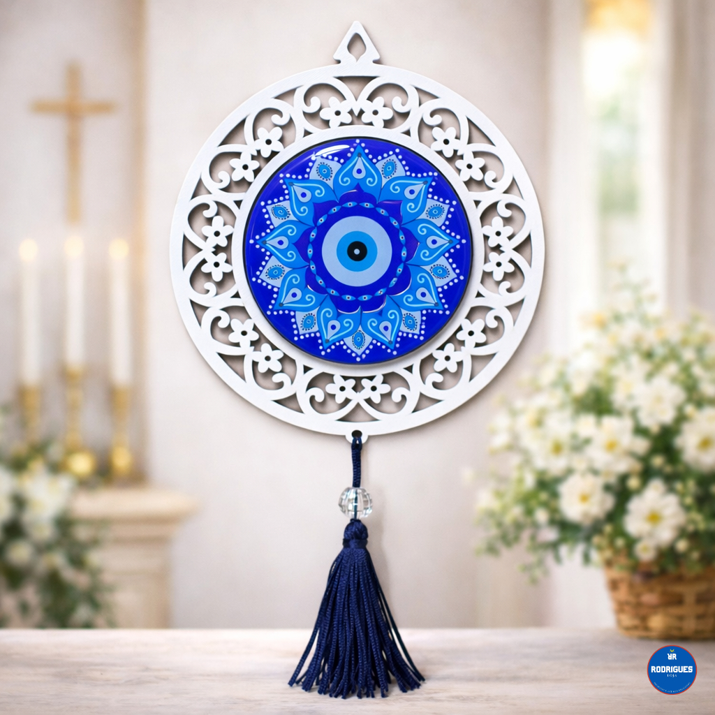 Adorno Olho Grego MDF Resinado 26cm Parede Porta Com Pompom Branco Marrom