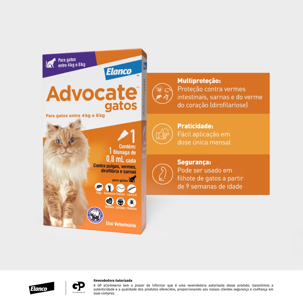 PRODUTO ORIGINAL COM NOTA FISCAL! - - - - - DESCRIÇÃO: O Advocate é um antipulgas desenvolvido pela Bayer. Eficiente e seguro, o Advocate possui versões para cachorros e gatos de diferentes faixas de peso. Desenvolvido a partir de pesquisas por profissionais capacitados, o Advocate é indicado para a prevenir e tratar infestações por pulgas, vermes (tipo relacionado à infestação de pulga), sarna e dirofilariose (verme do coração). - - - - - MODO DE USO: O Advocate é de uso tópico e deve ser utilizado seguindo as instruções abaixo: Retire a bisnaga plástica da embalagem. Segure-a na posição vertical e retire a tampa. Recoloque a tampa no sentido inverso ao anterior e gire-a, quebrando o lacre. Retire a tampa e aplique todo o conteúdo de uma única bisnaga diretamente sobre a pele seca do animal, na região da nuca ou da cernelha. - - - - - Enviamos o seu pedido o quanto antes possível! Obrigado pela preferência.